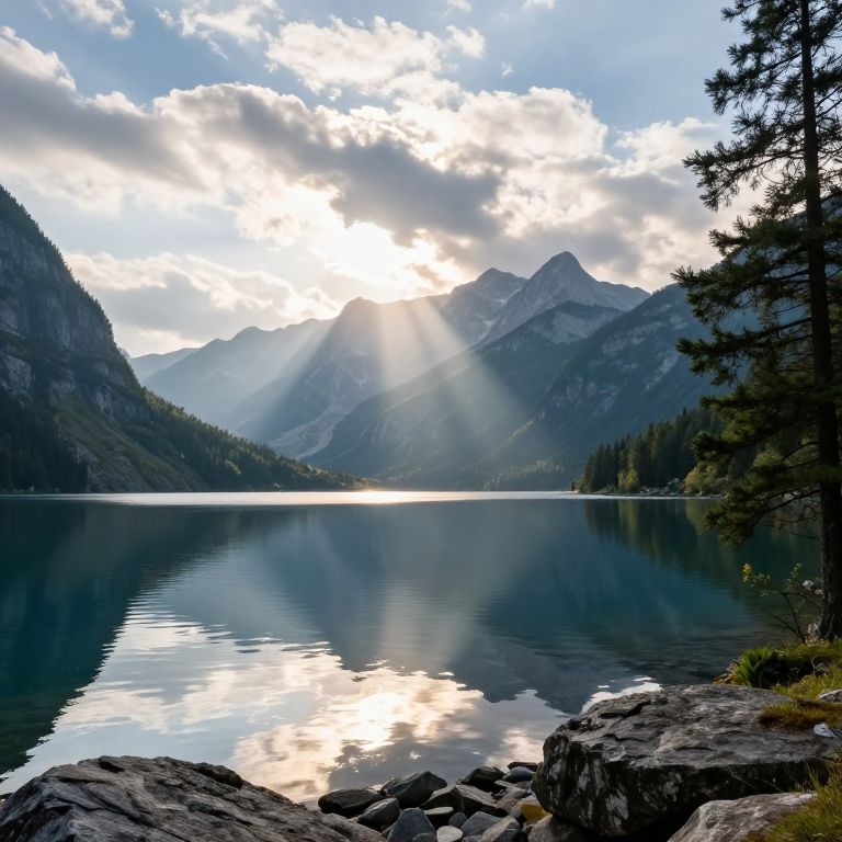 Photograph of a serene mountain lake at sunrise. Sunlight pierces through scattered clouds, casting rays over the calm, reflective water. Snow-capped mountains frame the background, with evergreen trees dotting the slopes. In the foreground, rocky terrain leads to the lake's edge. The sky is a mix of blue and white, with soft sunlight creating a peaceful atmosphere. The water reflects the mountains and sky, enhancing the scene's tranquility. The right side includes a tall pine tree, adding depth and natural texture.