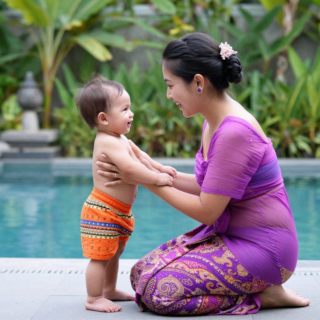 Woman in vibrant purple sari engaging warmly with a toddler wearing colorful orange-patterned shorts, both sharing a joyful moment outdoors near a serene poolside setting in Bali.