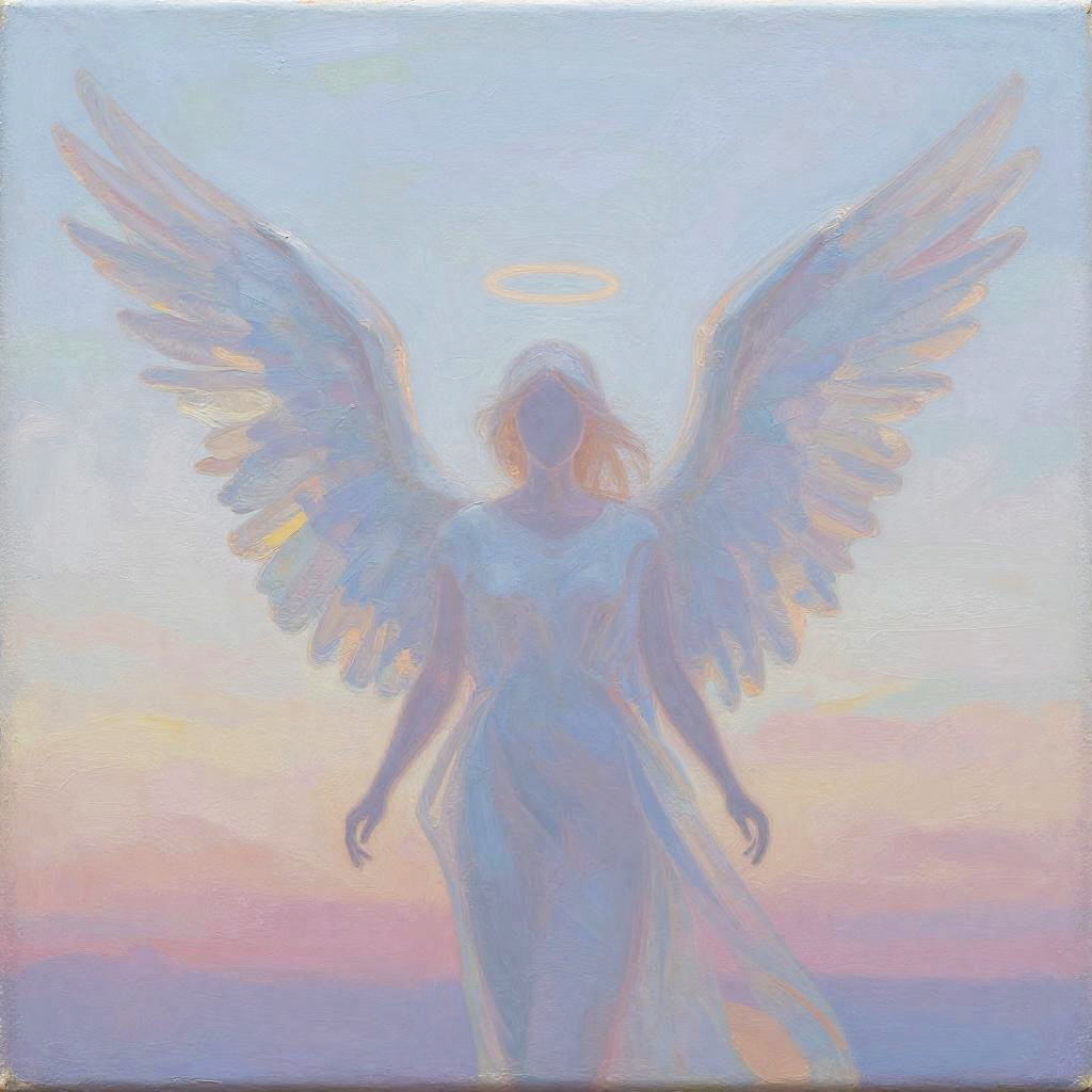 Faceless angel painting with large translucent wings spread wide, serene sky at dawn in pastel tones, abstract and dreamy composition, faint halo above the head, textured acrylic on canvas style.