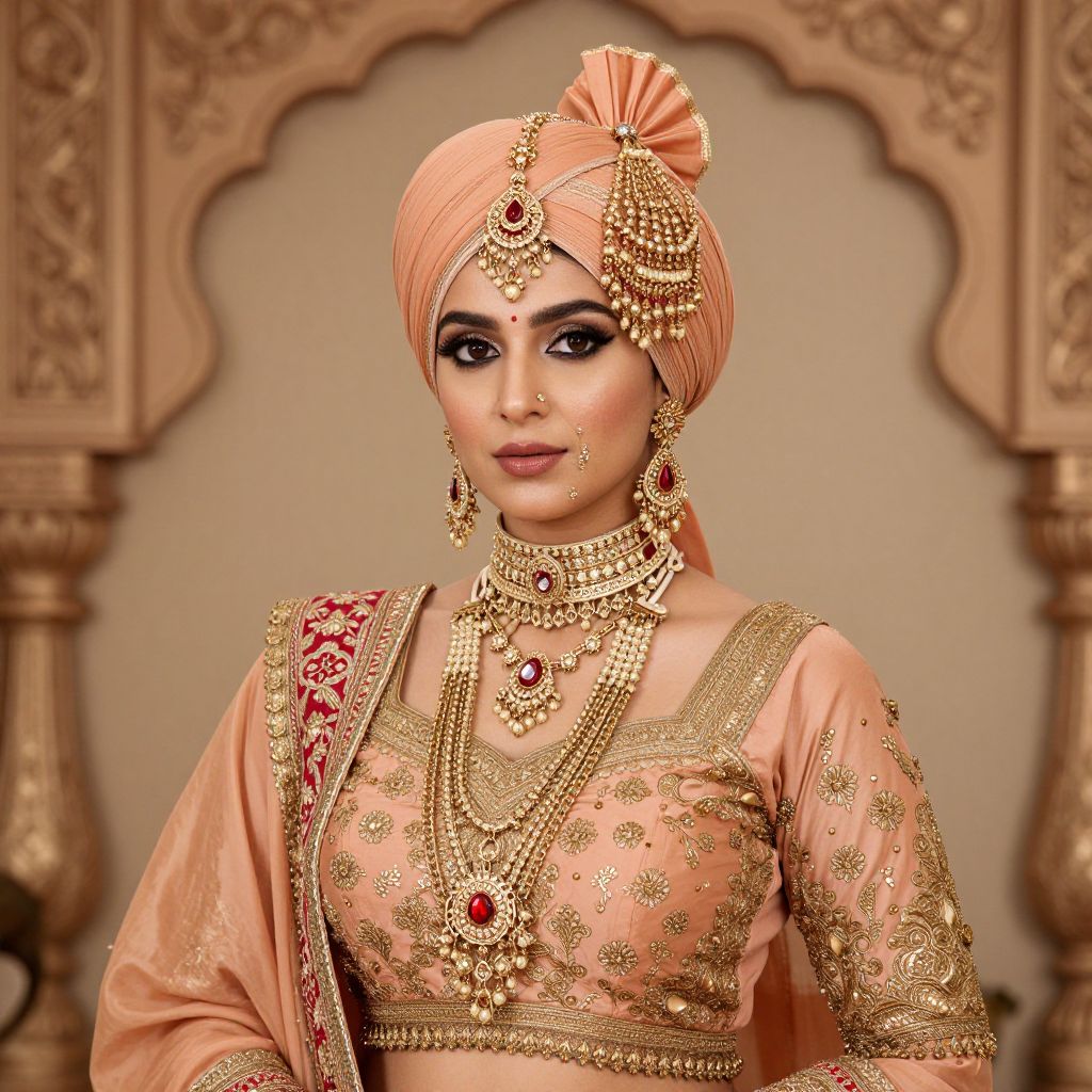 Sikh woman adorned in traditional attire, featuring a peach-colored turban embellished with intricate jewelry, a matching blouse with gold embroidery, layered necklaces, and dangling earrings, poised elegantly against a backdrop of ornate decor.