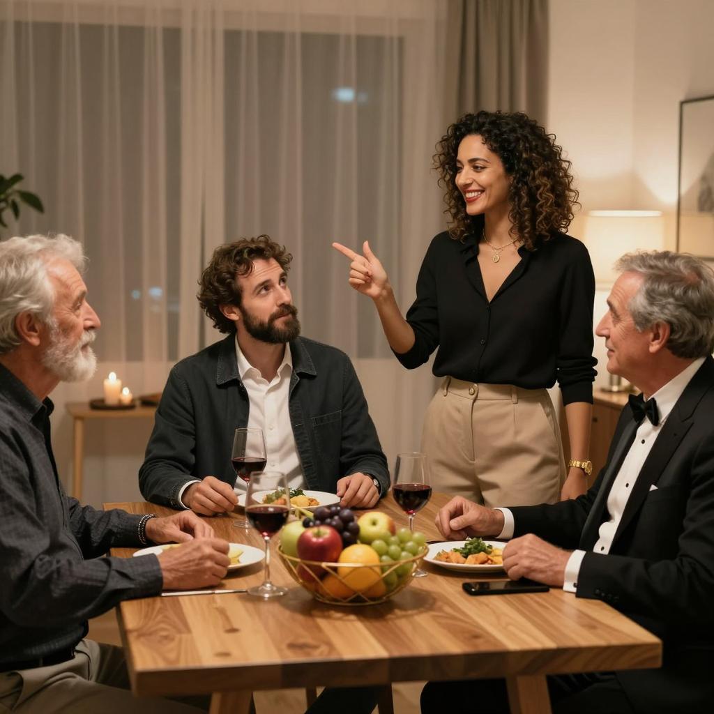A crowded indoor event. Large group of people, approximately 150, sitting and standing. Most wear formal attire, including tuxedos and dresses. Green and red lighting creates a colorful ambiance. People's faces show varied expressions, some smiling, others neutral. Background features hanging lights and green curtains. Front rows have people clapping. Mid-ground and back rows have people sitting and standing closely together.