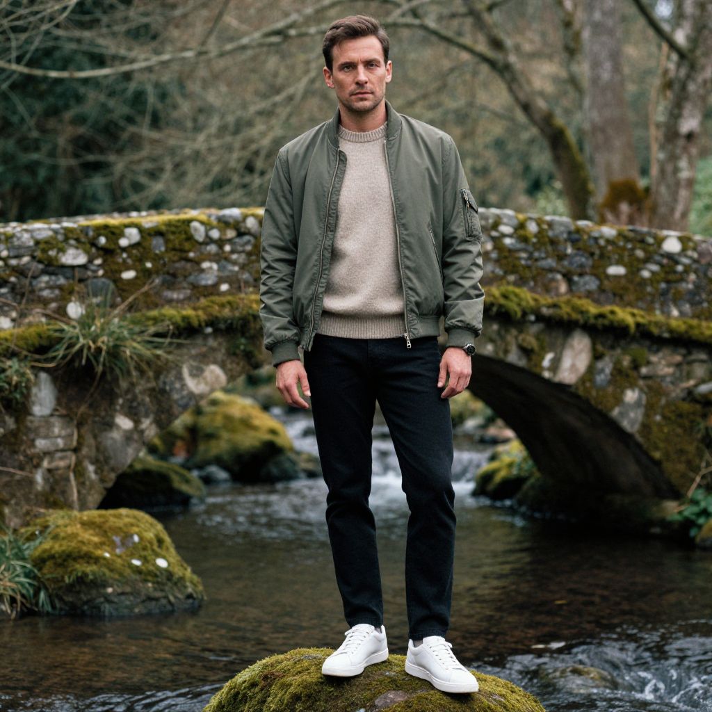 A man, beige crew neck cashmere sweater, slim-fit black jeans, classic white leather sneakers, tailored olive green bomber jacket, ancient stone bridge, overgrown with moss, tranquil stream flowing beneath, soft light filtering through trees, technicolor analog film stock, contemplative expressionMan has masculine face and piercing eyes