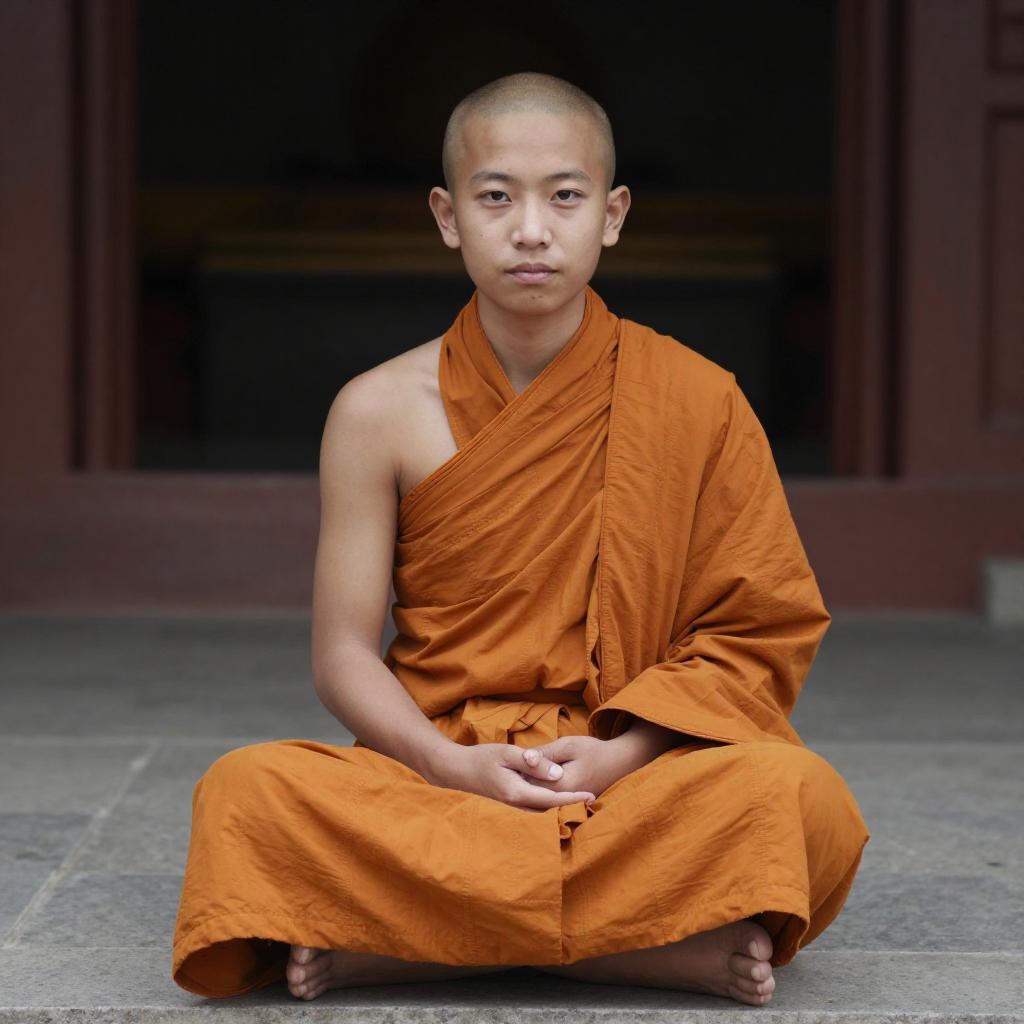 Photograph of a young Buddhist monk with a shaved head, sitting cross-legged on stone steps. He wears an orange robe, with the fabric draped over his shoulders and around his legs. The background is dark and blurred, creating a shallow depth of field that emphasizes the monk. Lighting is soft and even, highlighting his calm expression. The camera angle is slightly above eye level, capturing his full body.