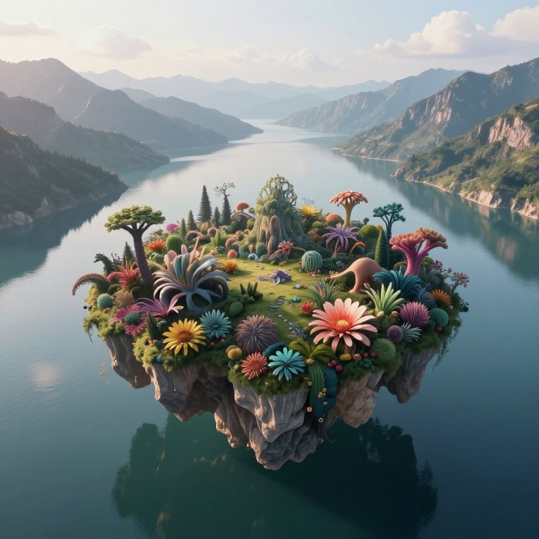 A serene island floats above a tranquil sea, while its mirrored reflection beneath the water reveals an inverted world where luminous orange fruits bloom from submerged roots, attracting schools of vibrant fish that swim through an ethereal, subaquatic \"sky.\