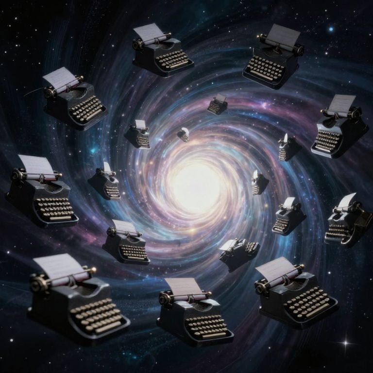 Digital artwork of black typewriters orbiting a luminous, swirling galaxy with vibrant blue and purple hues, set against a starry space backdrop.