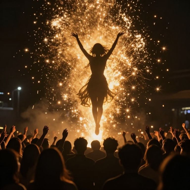 Photograph of a night-time crowd scene with a silhouetted woman leaping joyfully into a fiery explosion of golden sparks above. She has long hair and is wearing a flowing dress, arms raised triumphantly. The crowd below is darkened, raising their hands in excitement. The background is mostly black with some blurred lights, emphasizing the bright, energetic center. The image captures a sense of celebration and freedom, with the vivid sparks contrasting sharply against the dark night.