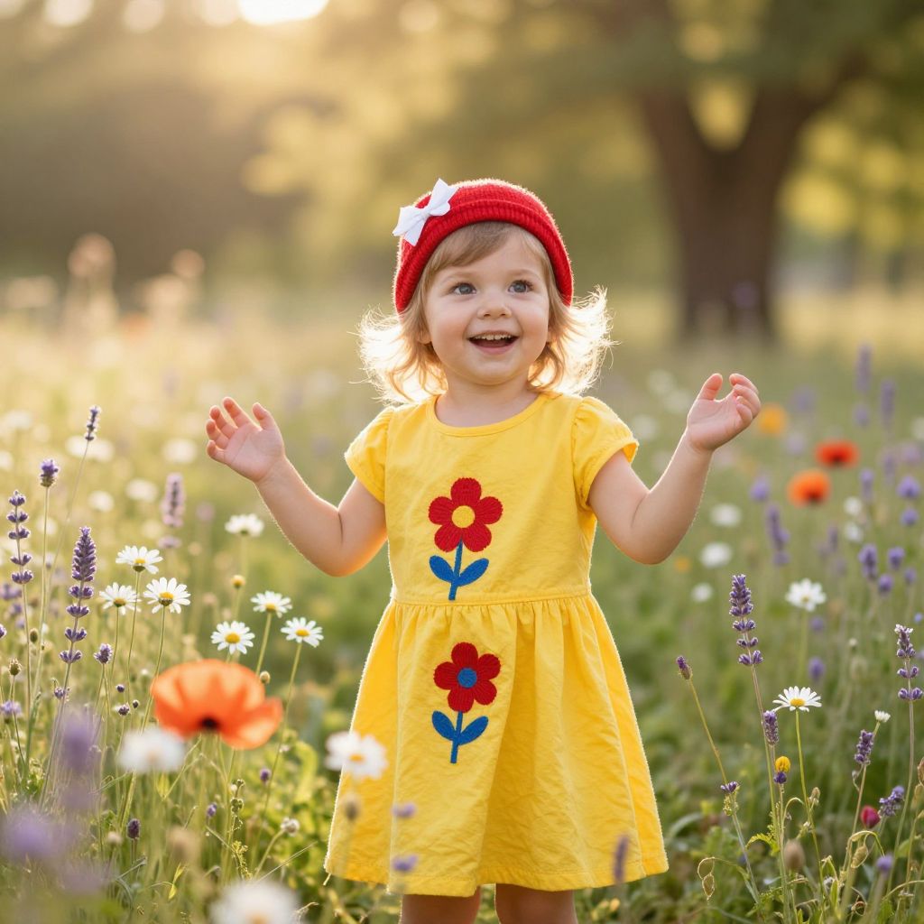 A small child, around 4 years old, wearing a bright yellow dress with a cheerful red and blue floral pattern on the front and a matching red knit hat with a white bow, stands in a sunny meadow filled with blooming wildflowers such as daisies, poppies, and lavender. Gentle sunlight filters through the trees, casting soft golden rays across the grass, with a light breeze gently rustling the flowers and her hair. She is smiling brightly and joyfully, her eyes wide with wonder, her hands slightly raised as if reaching out to the sky. The background is softly blurred to emphasize her cheerful expression and the vibrant colors of her outfit, creating a warm, nostalgic, and inviting atmosphere that captures the innocence and beauty of a simple, sun-drenched afternoon.