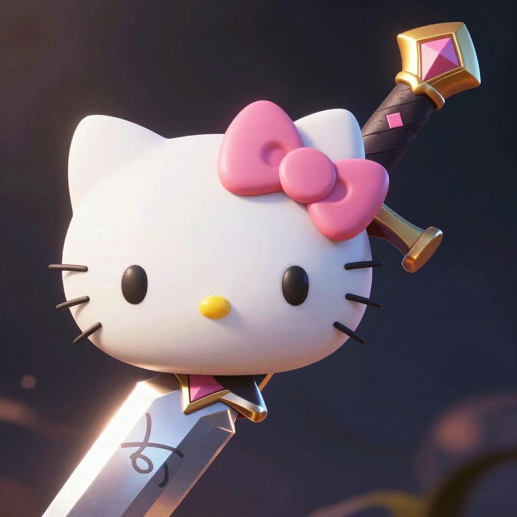 Close-up of hello kitty dagger hilt with signature bow, shining silver blade with pink accents, fantasy RPG style weapon concept, dynamic lighting, detailed textures