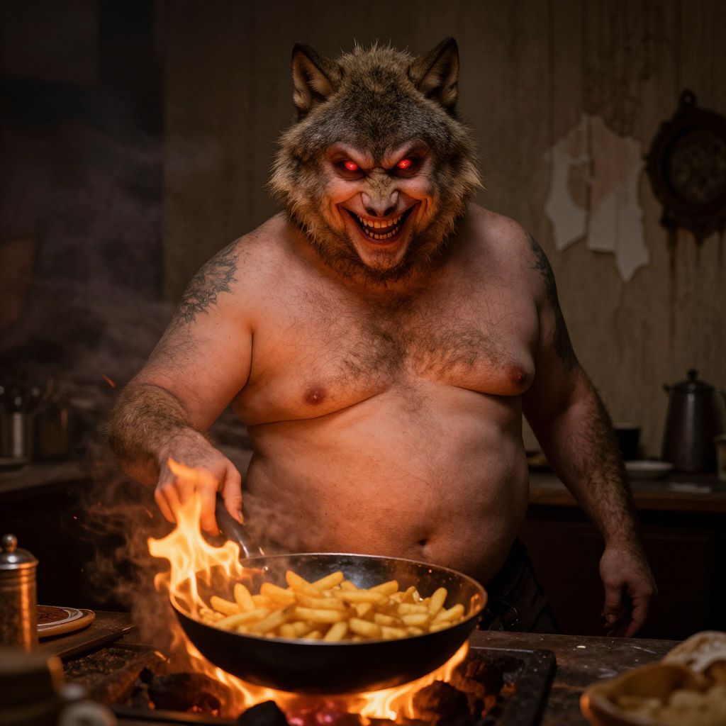 Photograph of a heavyset, shirtless man with a large belly, sitting on the floor amidst a cluttered room. He has short brown hair and is covered in sweat, his skin glistening under the dim light. A realistic, lifelike wolf statue stands to his left, facing him. Behind the man, an old-fashioned TV with a bright screen displays a blurry image. The floor is littered with food wrappers, soda bottles, and other trash. The background is dark, and the overall scene has a gritty, chaotic feel. The lighting highlights the man and the wolf, creating a stark contrast with the shadowy surroundings.