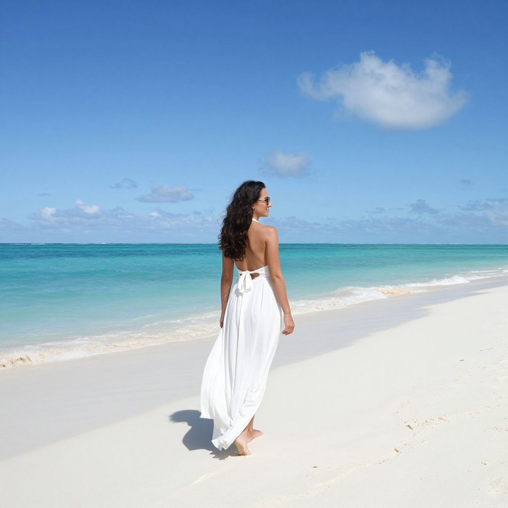 Photograph of a woman with long dark hair in a white sundress, standing on a pristine white sandy beach facing the vibrant blue ocean under a clear