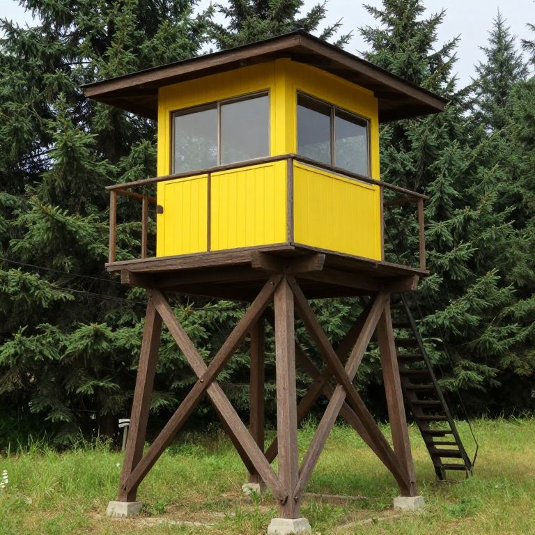 Photograph of a vibrant yellow lifeguard tower with dark brown wooden supports, elevated on four sturdy legs. The tower has large, rectangular windows and a small, dark brown roof. A black metal ladder is attached to the right side. The background features dense, green pine trees and a grassy field. The tower's bright yellow color contrasts sharply with the green surroundings, making it stand out. The grass beneath the tower is slightly overgrown, adding a natural, rustic feel to the scene. The image is bright, with natural daylight illuminating the entire setting.