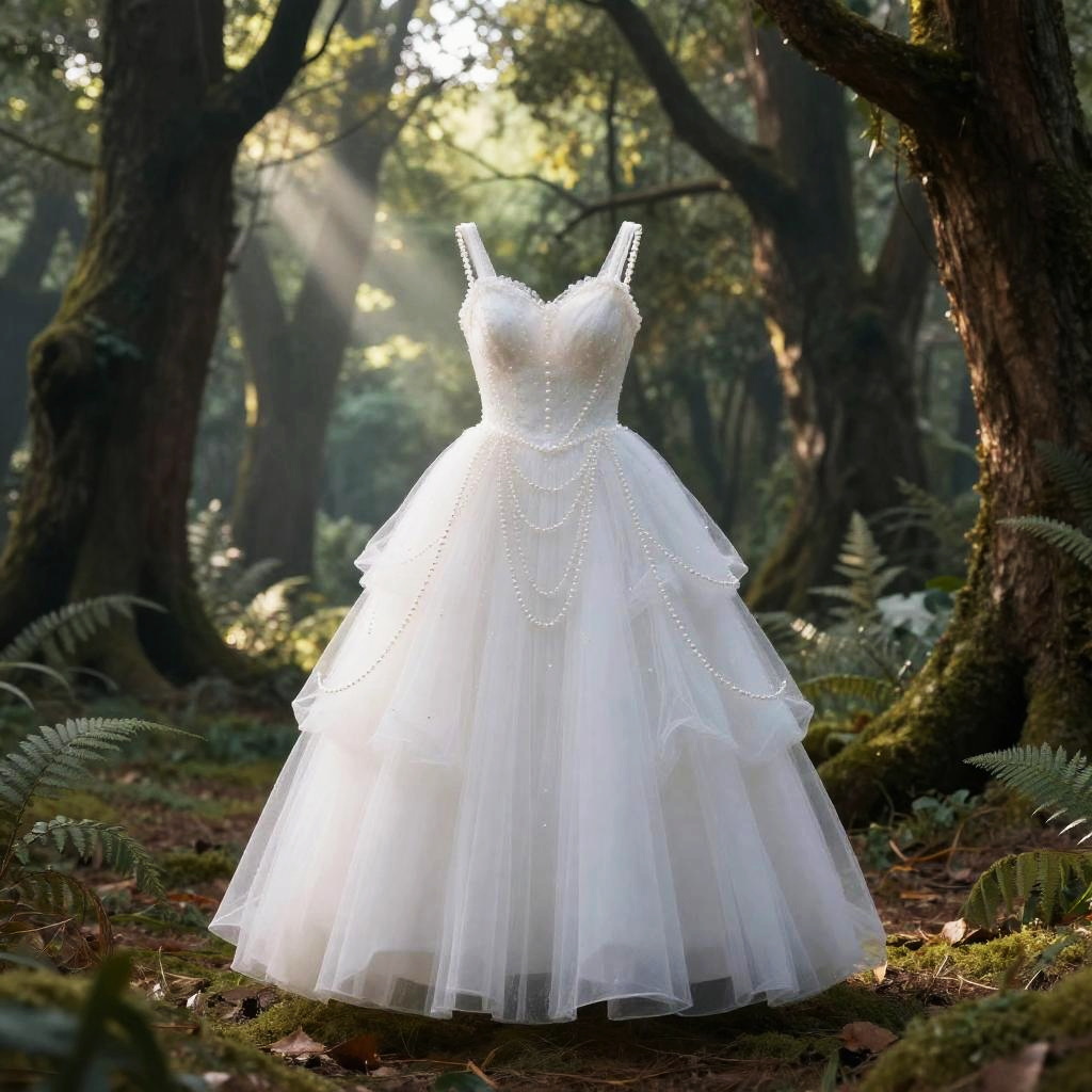 White maiden dress with layered tulle and delicate pearls, set against an enchanted forest backdrop, soft rays of light filtering through ancient trees, mystical and peaceful vibe