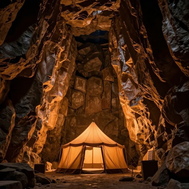 Photograph of a warmly lit, beige canvas tent set within a dark, rocky cave. The tent is centrally positioned, illuminated by a soft, orange glow from inside, creating a cozy contrast to the cave's rugged, shadowy surroundings. The cave walls are jagged and textured, with natural light highlighting their irregular edges. On either side of the tent, small black boxes are placed on the cave floor. The tent's entrance flaps are slightly open, revealing the warm light within. The overall composition evokes a sense of adventure and tranquility amidst a natural, secluded environment.