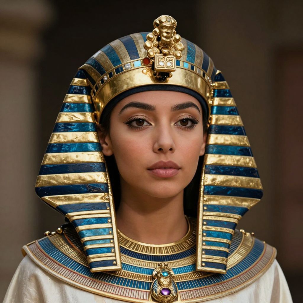 Queen Pharaoh Costume, a close up of a woman wearing a costume with a crown on