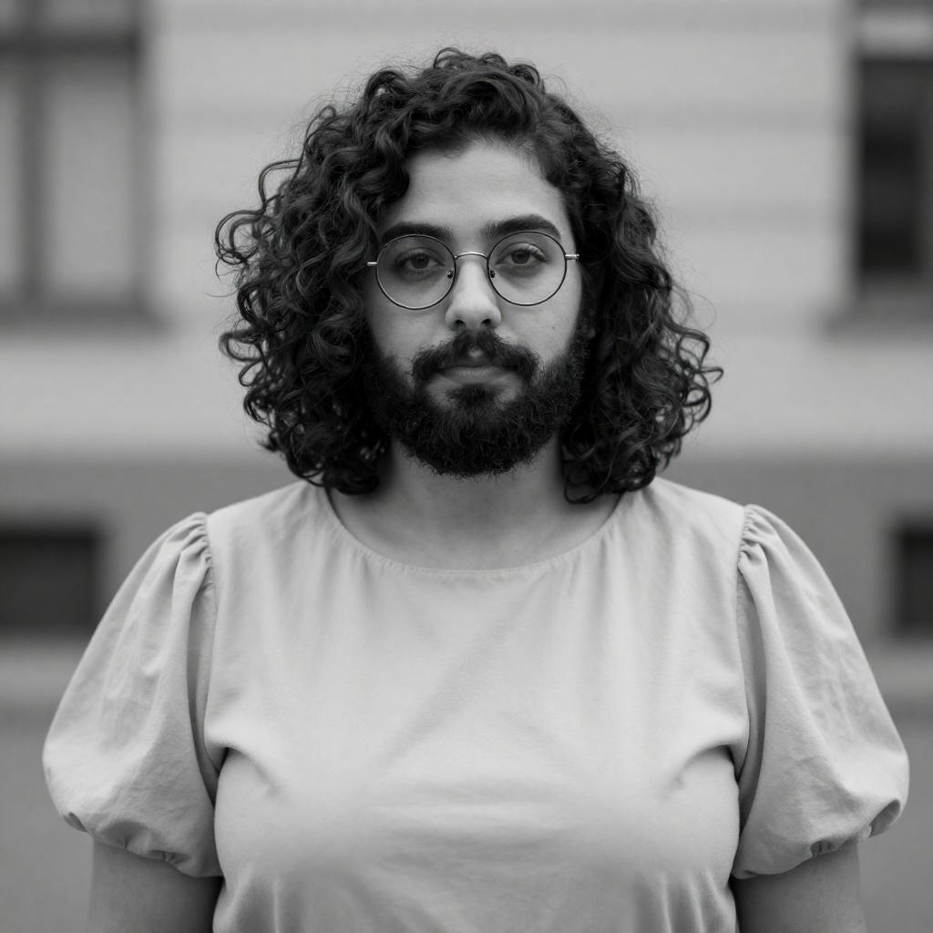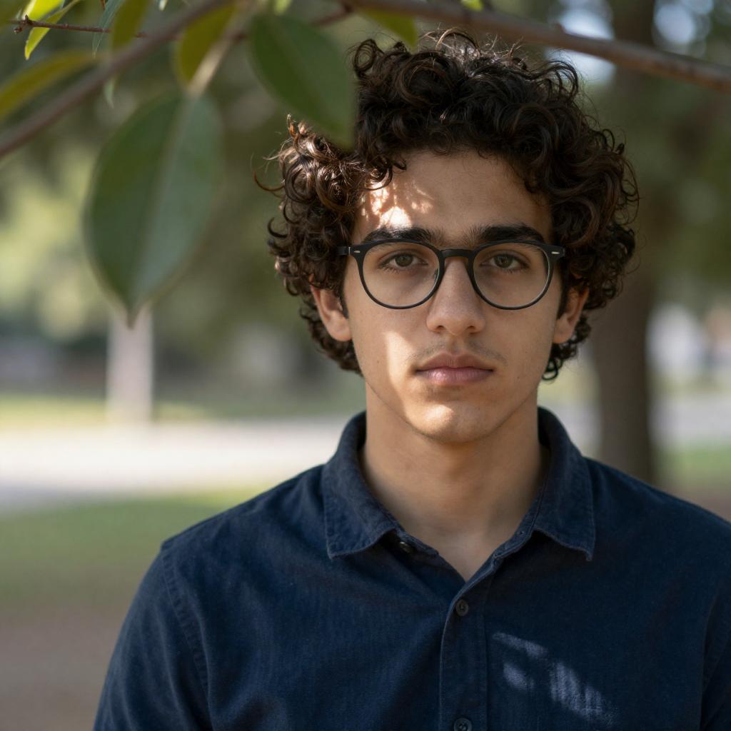 Photograph of a young man with curly brown hair and glasses, partially obscured by green branches. He wears a dark blue shirt and looks intently at the camera. Sunlight filters through the trees in the background, creating a dappled light effect. The man's expression is serious and focused.