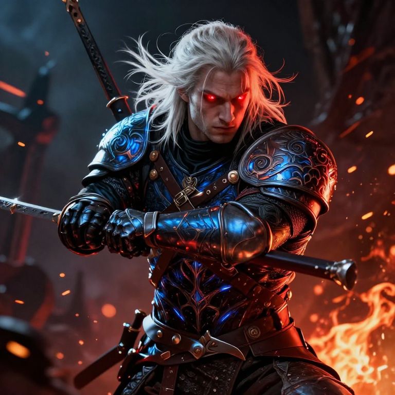 In this dynamic and intense scene, Geralt of Rivia, a central figure, is captured in a moment of fierce combat. His white hair, illuminated by a fiery glow, flows dramatically, adding a sense of motion and energy to the composition. His eyes, glowing with an otherworldly red, reflect his intense focus and determination. Geralt's armor, intricately designed with glowing blue and red accents, contrasts sharply with the dark, ominous background. The armor's ornate patterns and the intricate details on his gauntlets and pauldrons suggest a high level of craftsmanship and power. The background is a mix of dark hues and fiery streaks, enhancing the dramatic atmosphere and emphasizing the action. The overall composition is balanced yet dynamic, with Geralt positioned centrally, drawing the viewer's eye to his intense expression and the intricate details of his armor. The interplay of light and shadow, along with the vibrant colors, creates a visually striking and emotionally charged image.