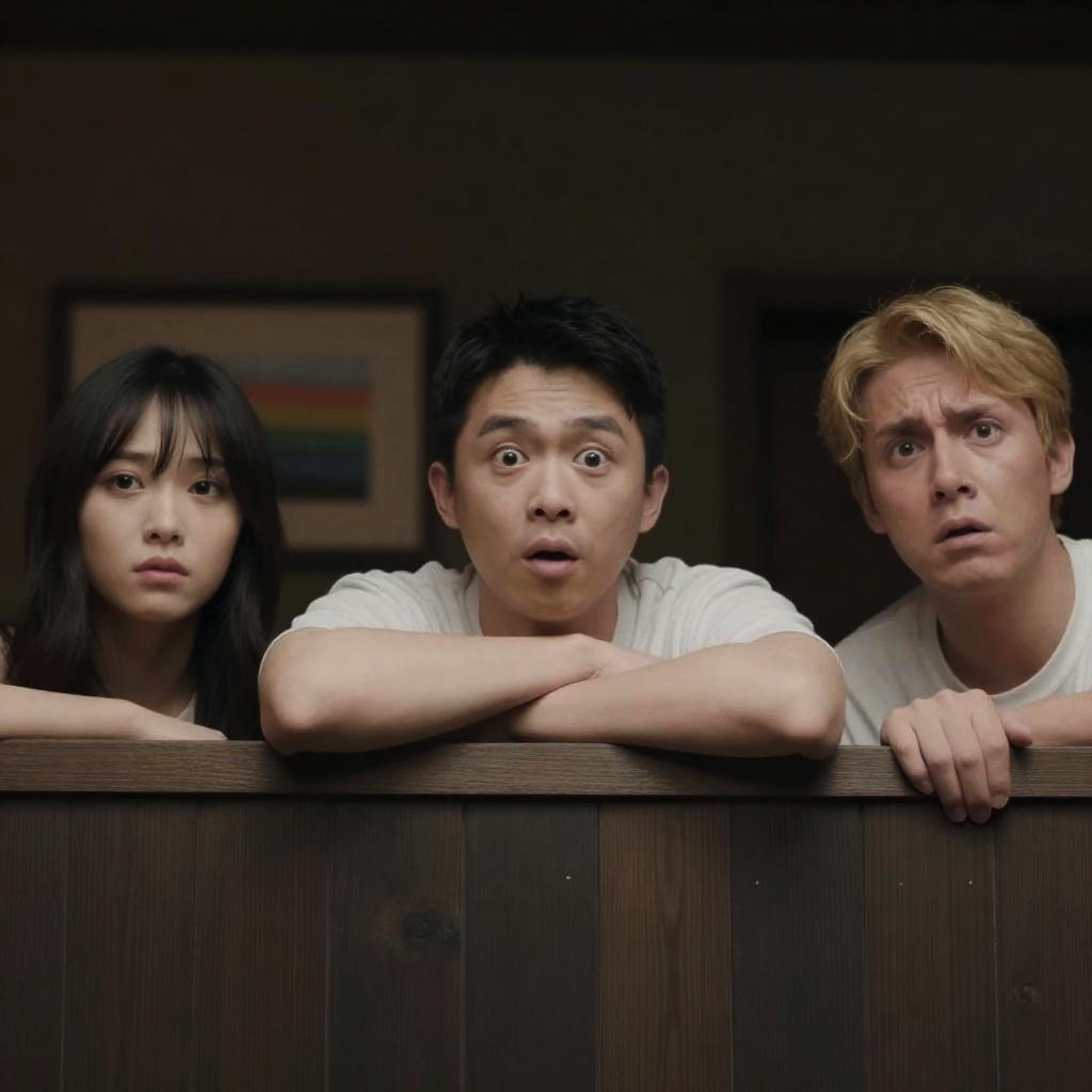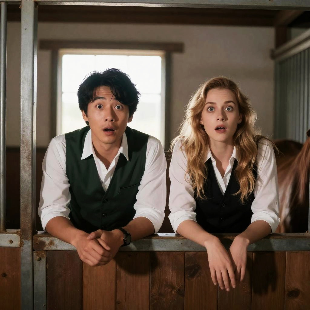 Two people in an old wooden stable. Asian man with black hair, surprised expression, wearing green vest over white shirt. Blonde woman with loose hair, surprised expression, wearing white shirt and black vest, leaning over wooden barrier. Wooden post in foreground, horse's leg partially visible on right. Sunlight filtering through window in background.