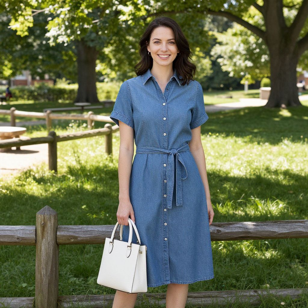 Photograph of a smiling woman with shoulder-length brown hair, wearing a black-and-white striped dress and white cardigan, walking on a suburban sidewalk with