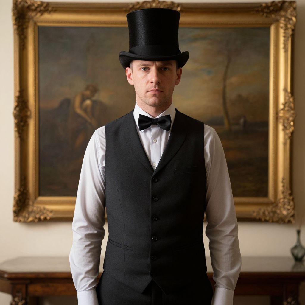 "Formal Attire Chubby, man in a vest and hat standing in a room"
