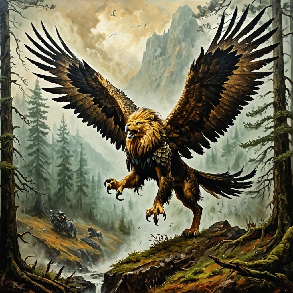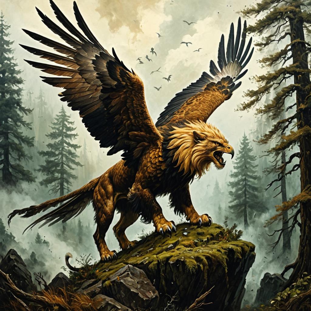 Oil painting of a majestic griffon with a lion's body and an eagle's head, depicted in earthy ochre and moss green tones. The griffon is showcased with large outstretched wings, sharp claws, and a fierce expression, set against a misty forest background with tall trees and a rocky stream.