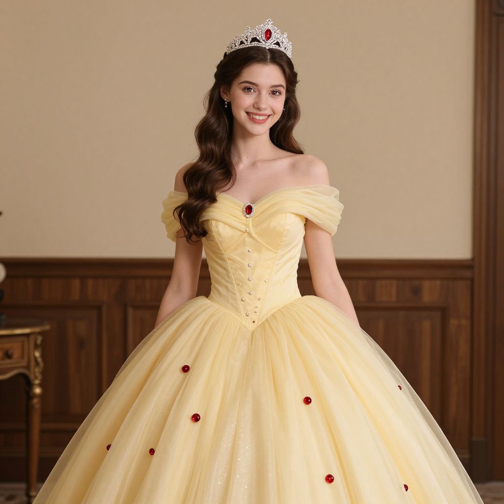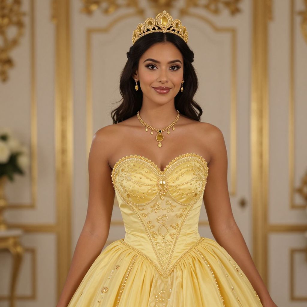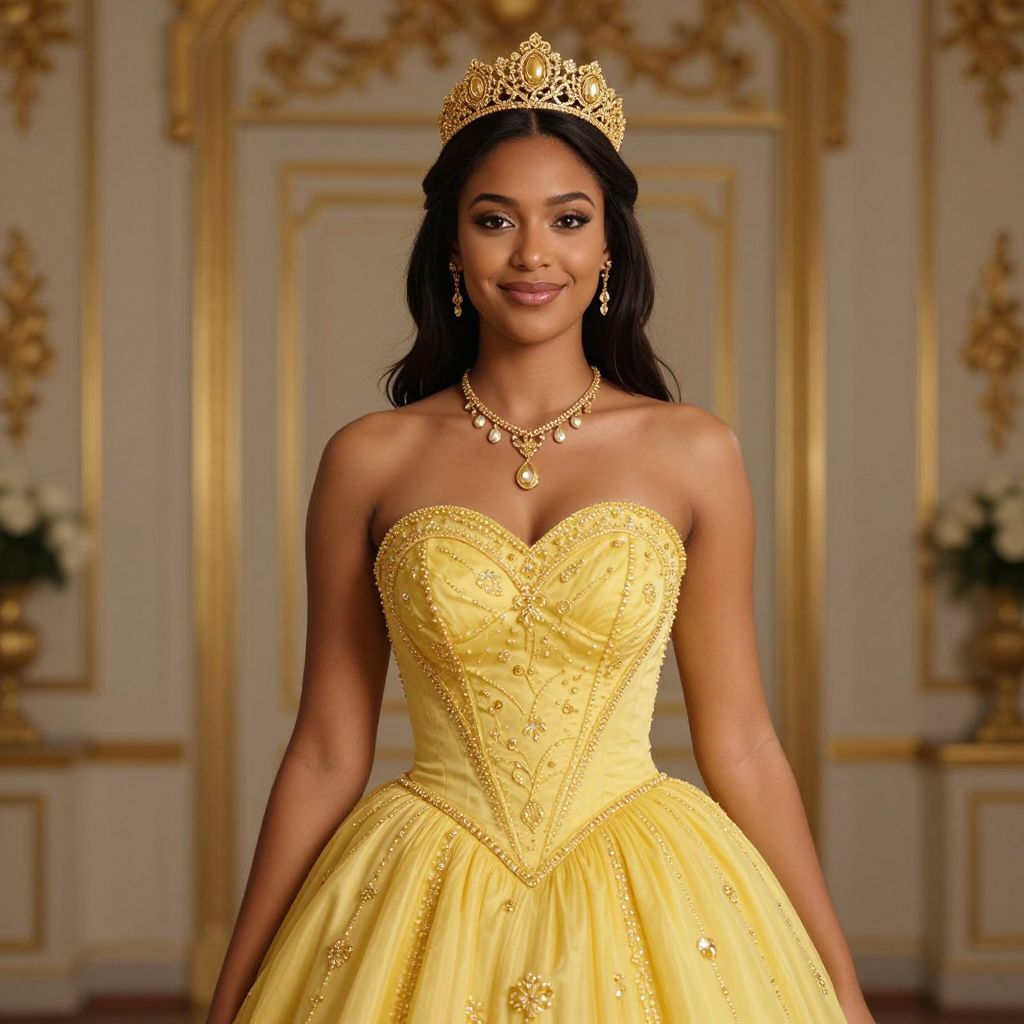 Photograph of a beautiful young woman with medium brown skin and long dark hair, wearing a golden tiara and matching jewelry. She's in a strapless, yellow, heart-embellished gown with a detailed bodice and full skirt. She's smiling softly, standing in a warmly lit, ornate room with gold accents. The background is blurred, drawing attention to her elegant, regal appearance.