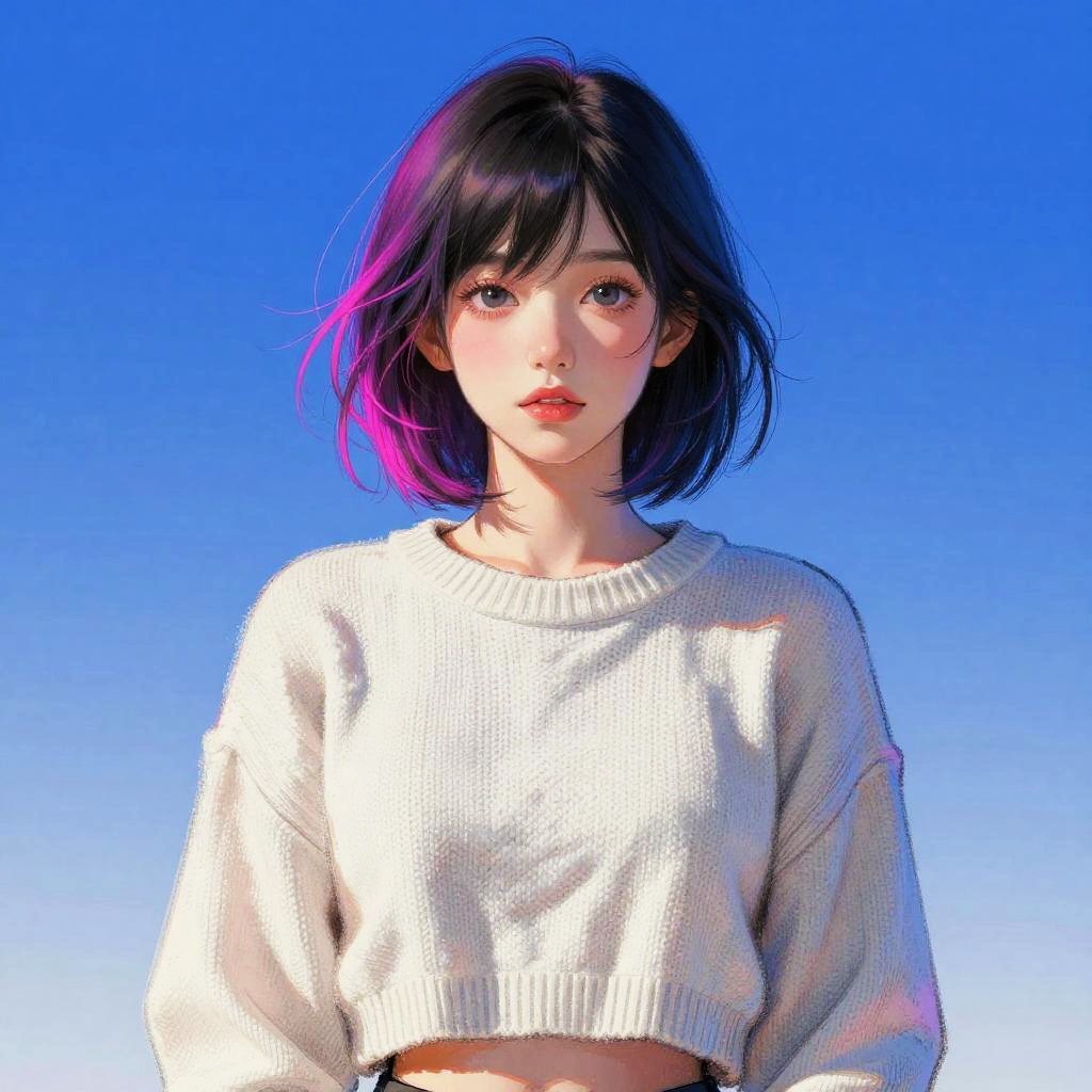 Illustrator, anime, realistic, sketch, 1girl, lip, Sweater, order, Blue gradient background, Neon hair, Textured crop, Canadian, (masterpiece, best quality)