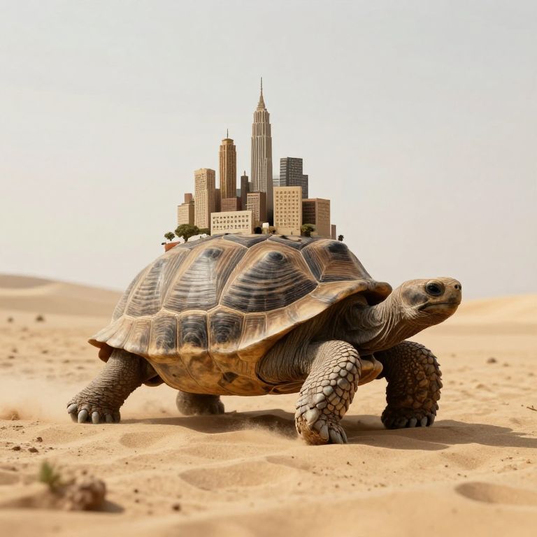 Amidst a desolate expanse, a colossal tortoise bears the weight of a miniature civilization on its shell, symbolizing the delicate balance between burden and resilience, as the timeless march of progress echoes softly against the whispering sands.