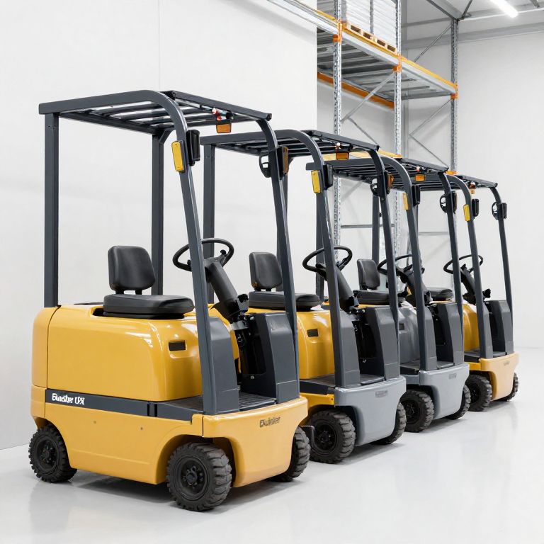 "Boulder Yale UX complete series lift trucks in a V style line up in a clean white warehouse with racking in the background, photorealistic, cinematic,"