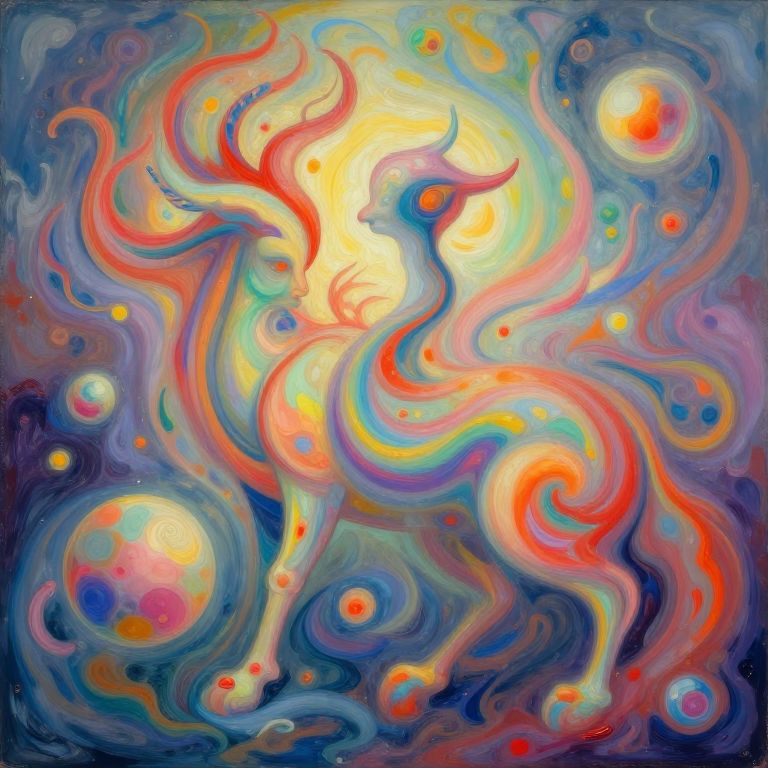 Vibrant, abstract painting of a mythical, flowing, multi-colored unicorn-like creature surrounded by swirling, glowing orbs in a cosmic blue and yellow background