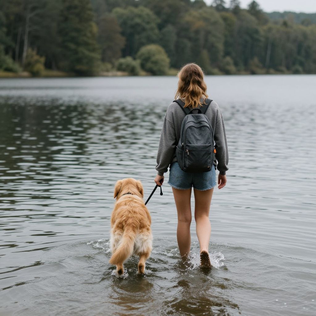 Woman and Dog on Serene Lake