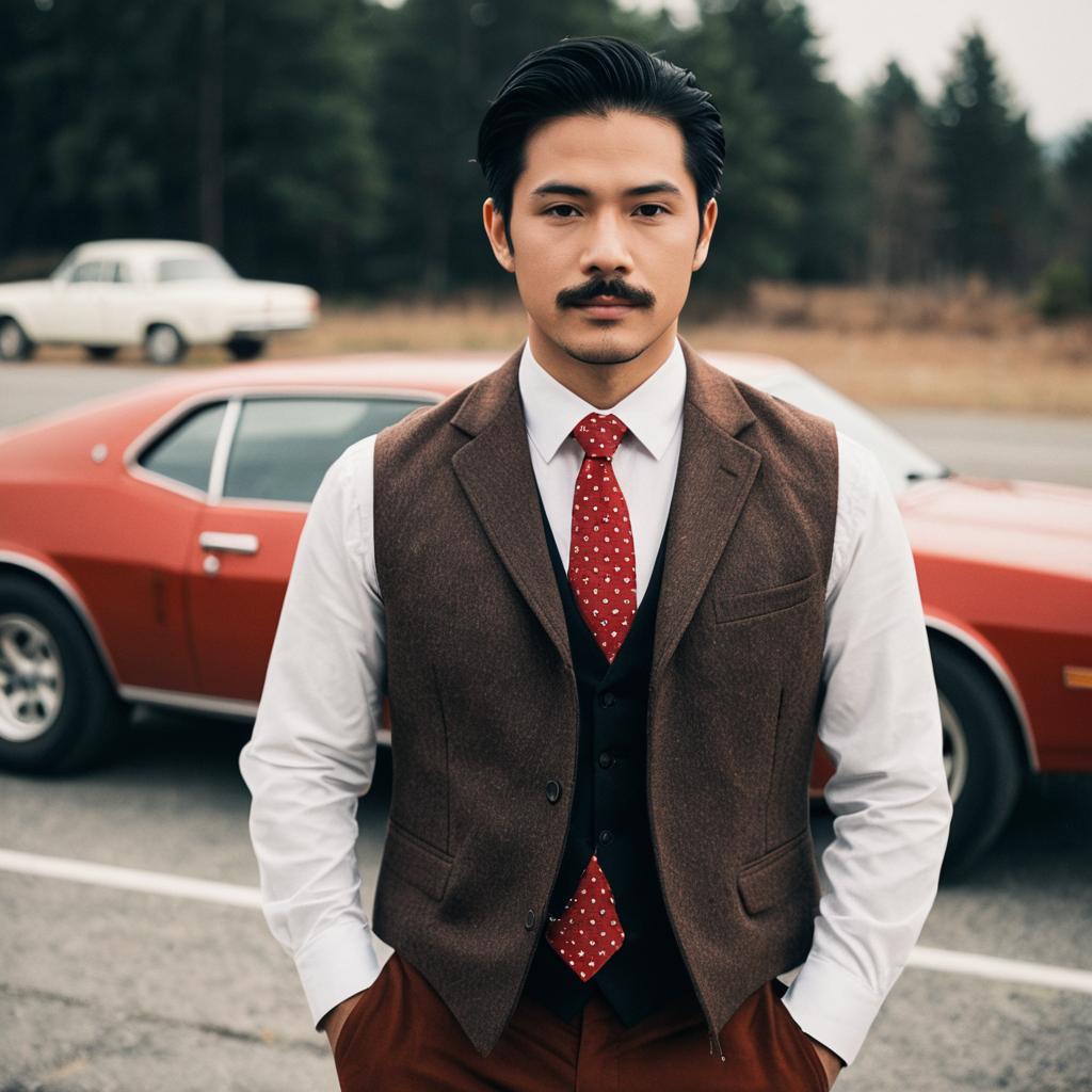 Portrait of an Asian man wearing a black safety jacket with a yellow 'SAFETY' patch and a matching black and white baseball cap with yellow lettering. The man has short black hair, facial hair, and is dressed in casual workwear including a gray shirt and blue jeans, standing in a large industrial indoor space with natural light coming through high windows.
