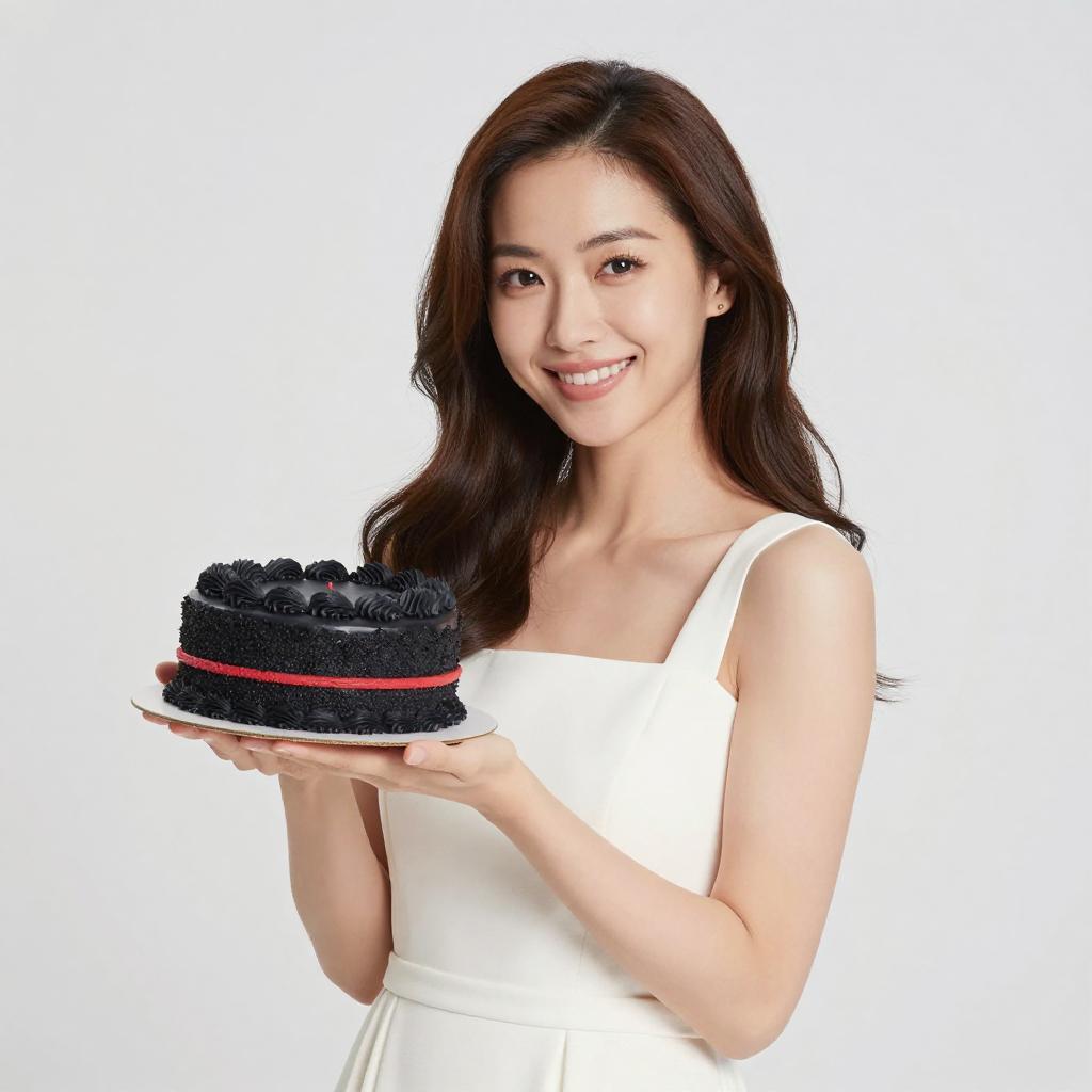 Photograph of an Asian woman with long, wavy brown hair and fair skin, smiling while holding a plate of black cake with red ribbon. She wears a sleeveless white dress, and the background is plain white, making her the focal point. The cake has a textured, ruffled black frosting. She holds the plate with both hands at chest level, looking directly at the camera. Her expression is happy and inviting. The image has a bright, clean, and modern aesthetic.