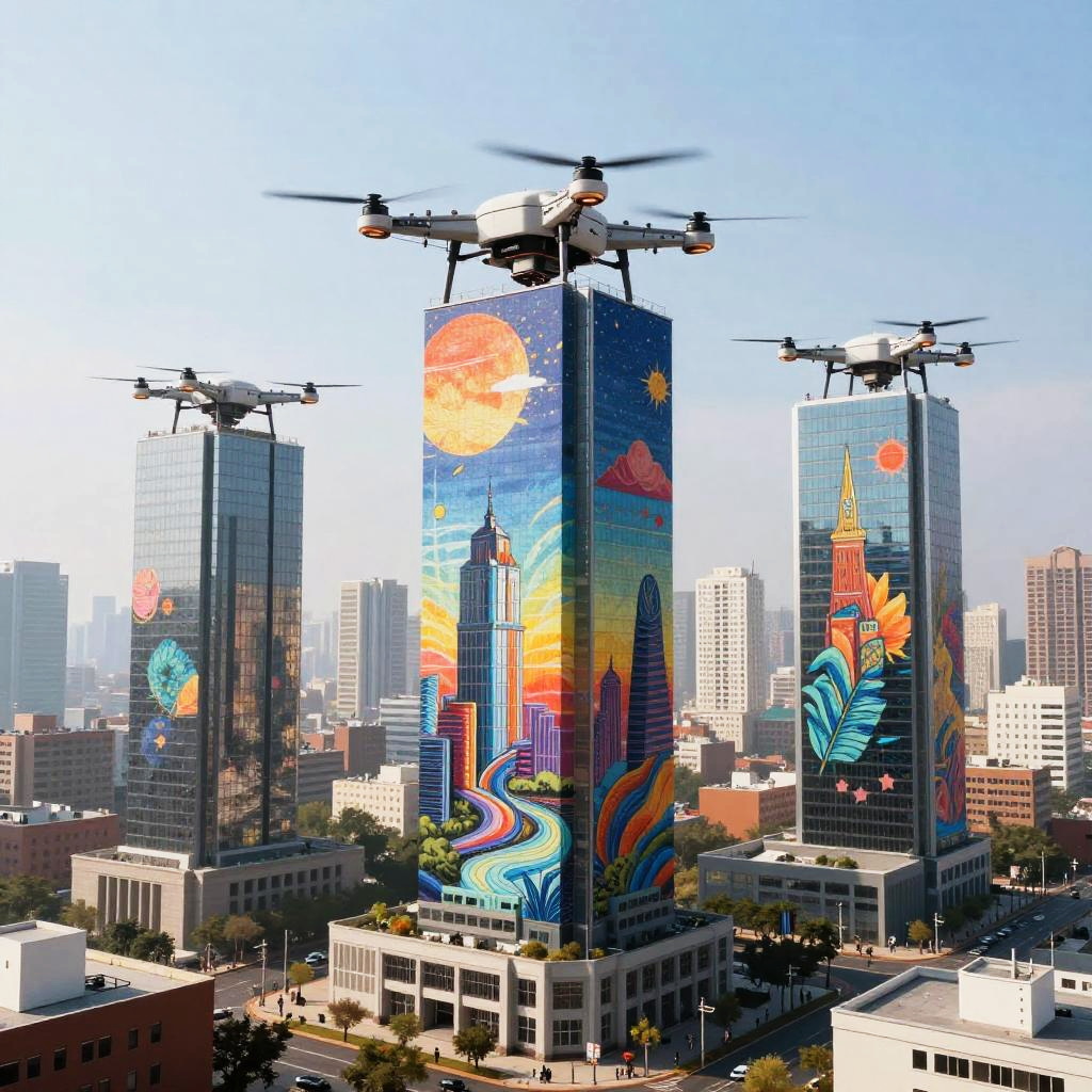 Photorealistic digital artwork of a futuristic, neon-lit, cylindrical structure in a cityscape at night, with hovering drones and illuminated skyscrapers