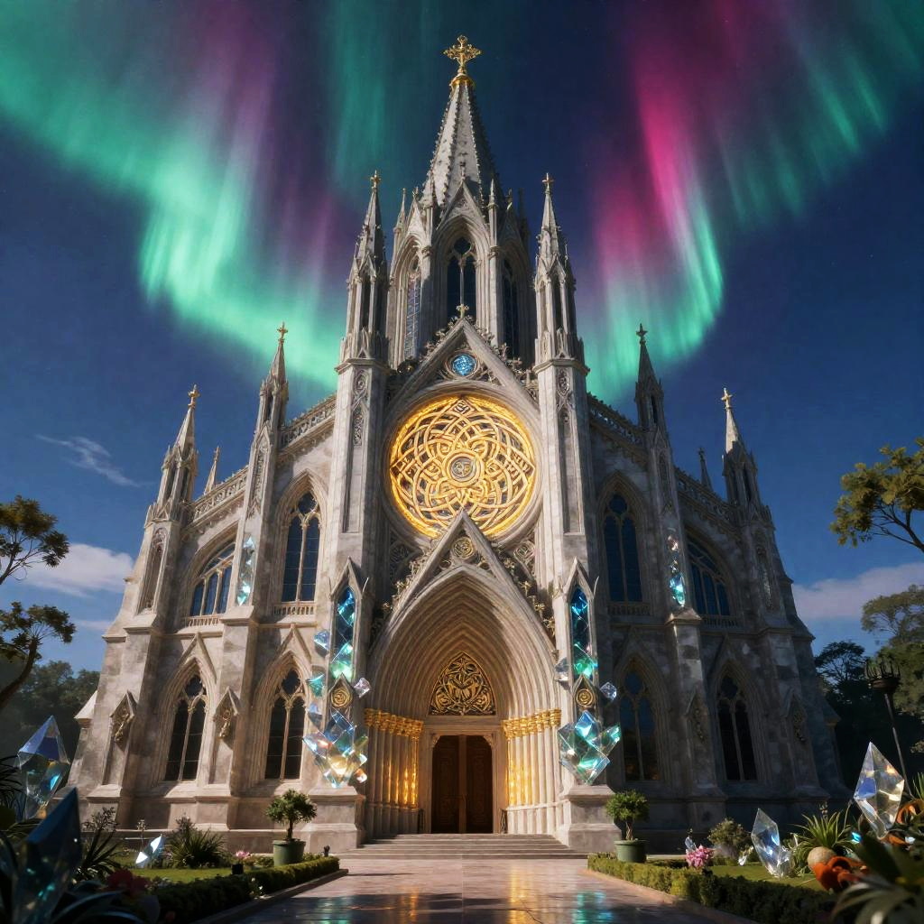 A beautiful and highly detailed digital painting of an elven cathedral in a beautiful garden in a crystal cavern beneath an aurora-lit sky, aurora gradient (teal, magenta, gold, deep indigo), celtic, luminescent fractal Celtic knotwork fused with crystalline filigree, intricate details, epic scale, insanely complex, cgsociety, 8 k, sharp focus, hyperrealism, by alex grey, caspar friedrich, albert bierstadt, james gurney, brian froud