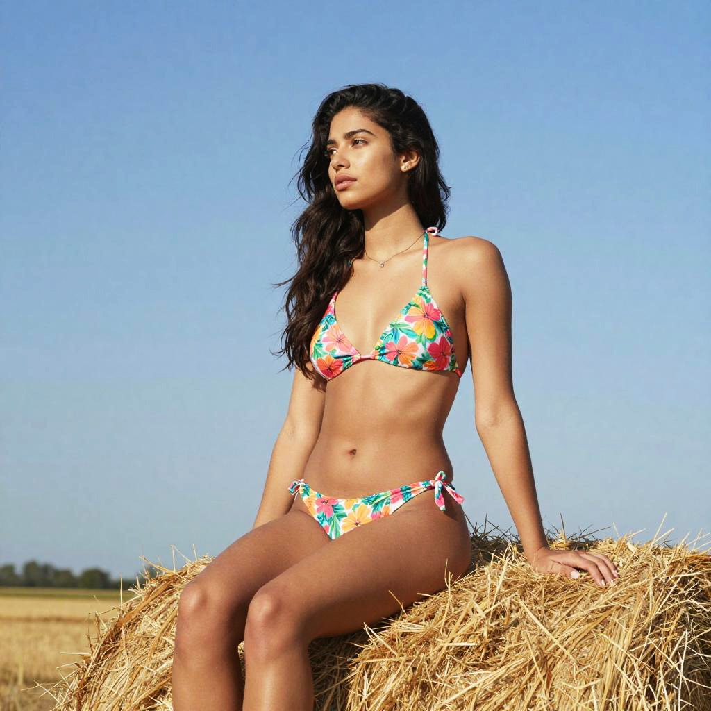 A young woman sits gracefully on a hay bale, exuding a sense of summer tranquility. She wears a vibrant floral bikini that complements the bright blue sky and golden fields around her, capturing the essence of a carefree outdoor lifestyle.