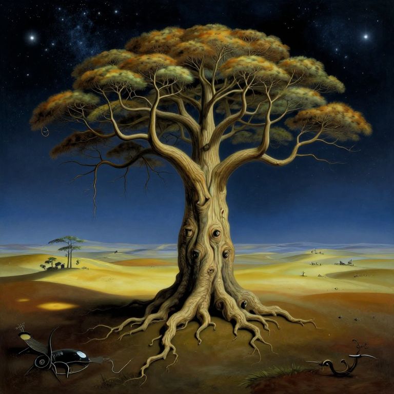 Imagine an expansive oil painting depicting the breathtaking perspective from a dragonfly resting atop an immense, ancient tree, its limbs extending like tendrils towards a luminous night sky filled with twinkling stars. In the foreground, the tree's roots are entwined with remnants of an abandoned medieval village, now reclaimed by nature. The scene is bathed in a warm, golden twilight glow, reminiscent of a second sunset rising. This ethereal atmosphere blends dreamlike tranquility with a sense of melancholic longing, evoking both wonder and sorrow, reminiscent of the haunting beauty found in the works of Ivan Shishkin or Arkhip Kuindzhi.