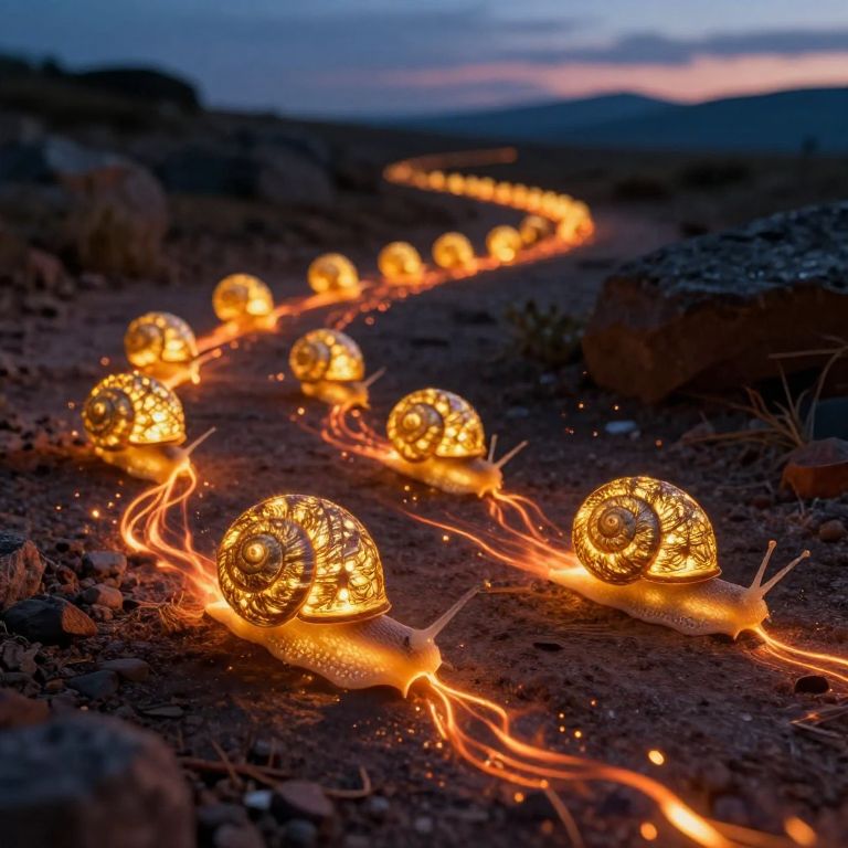 Photograph of glowing, intricately patterned snails on a dark, rocky path at dusk, with their illuminated trails creating a magical, ethereal
