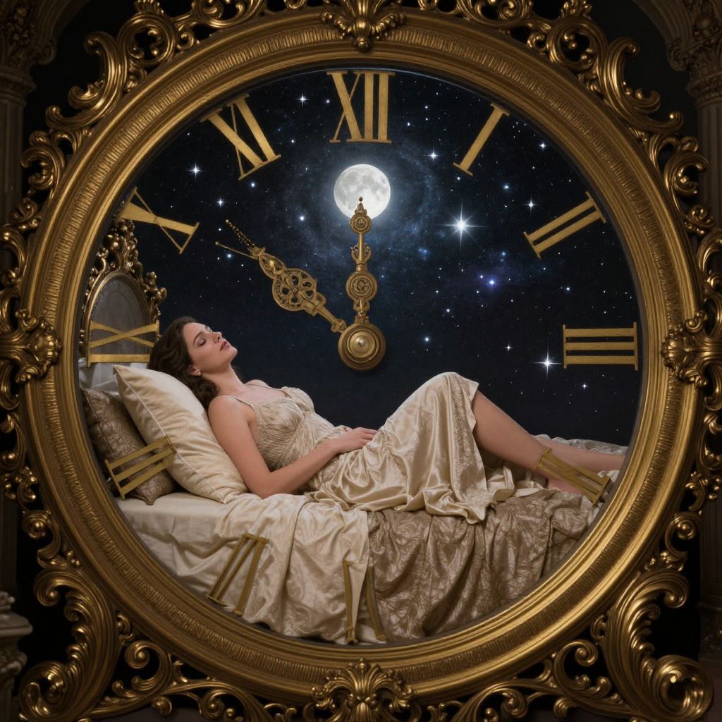 A woman rests serenely within an ornate, circular brass bed framed like a luxurious timepiece, her dreams unfolding against a celestial backdrop of stars and moonlight, evoking a blend of vintage elegance and surreal fantasy.