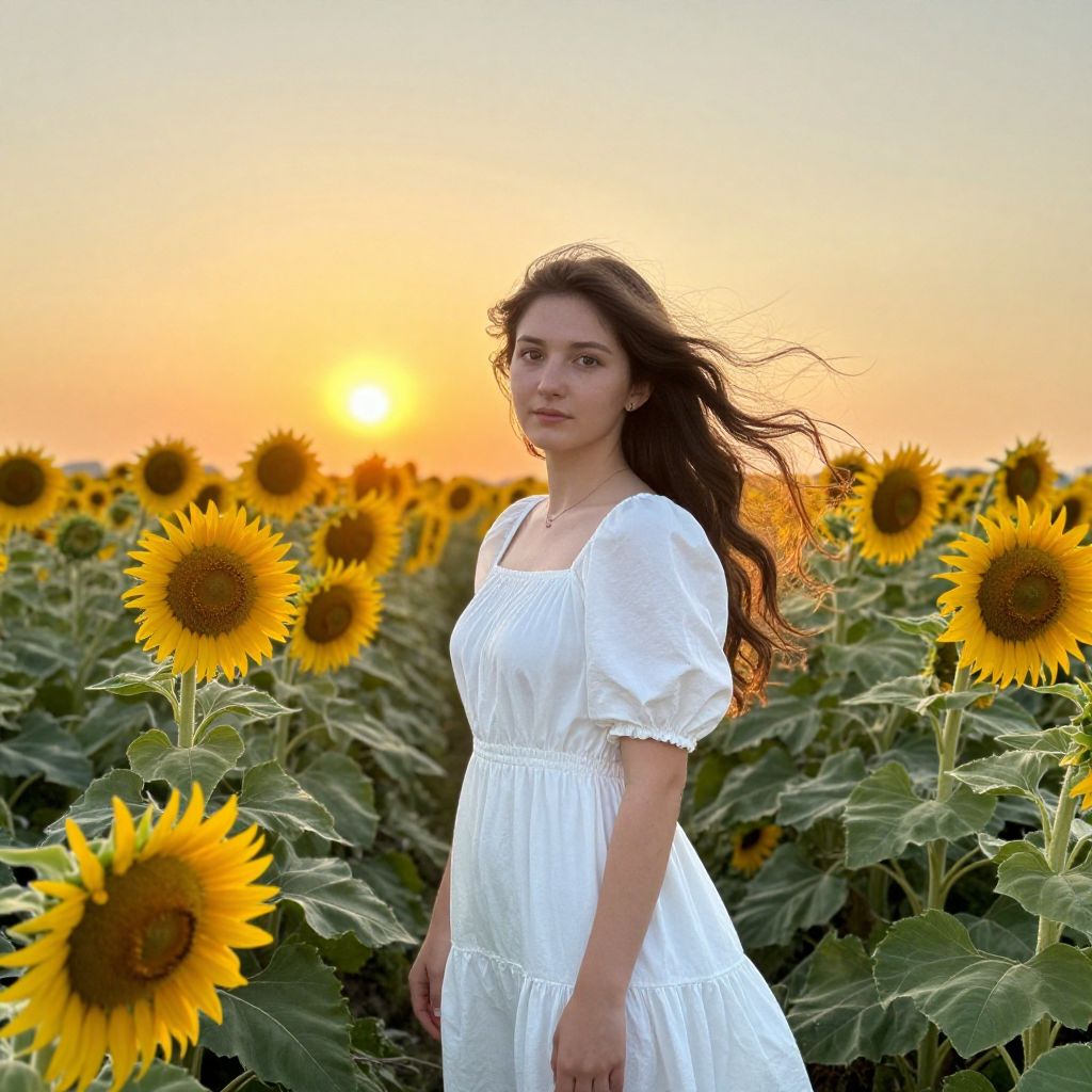 Photograph of a young woman with long, wavy brown hair standing in a sunflower field at sunset. She wears a white, short-sleeved, lace-trimmed dress with a gathered waist. The sun, low on the horizon, casts a warm orange and yellow glow across the scene, illuminating the vibrant yellow sunflowers surrounding her. Her expression is calm and slightly smiling, with her hair gently blowing in the breeze. The background is a sea of sunflowers, with the sky transitioning from orange to light blue as the sun sets. The overall mood is serene and picturesque.