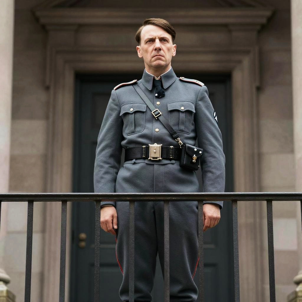 Hitler Fancy Dress, dressed in uniform standing on a balcony railing