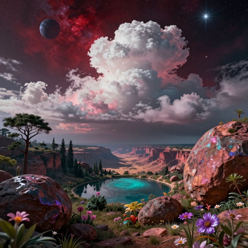 Fantastical digital landscape: vibrant flowers, rocky terrain, turquoise lake, starry sky, giant clouds, distant planet, colorful sunset, mystical mountains