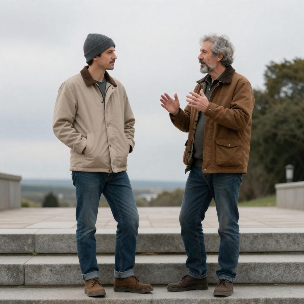 Photograph of two men standing in a city square. The man on the left has dark hair, glasses, a brown hat, beige jacket, and holds a camera and backpack. The man on the right has curly brown hair, blue jacket, and holds a phone. Background features a beige building with multiple windows and parked cars. Both men look forward. The left man has a beard. Overcast sky.