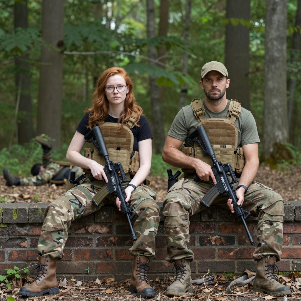 Two people sitting on a brick wall in a forest. Both wear camouflage pants and tactical vests, with brown boots. The woman has long red hair, glasses, black t-shirt, and holds a black rifle. The man wears a cap, green t-shirt, and holds a black rifle. A person in camouflage lies on the ground in the background. Bright green foliage and tall trees surround them. Both have serious expressions.