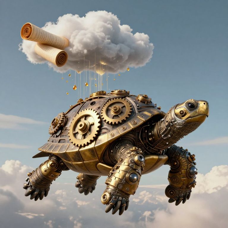 Steampunk-style, mechanical turtle with gears and cogs flying through the sky, carrying a cloud with a rolled-up scroll. Blue sky background.
