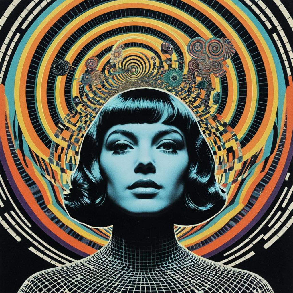 A psychedelic collage with a feel of a vintage surreal art house 70s sci-fi animation combined with a psychedelic collage created out of spliced photographs, psychedelic portraits, dimensional sculptures, vortex spirals, melting grids
