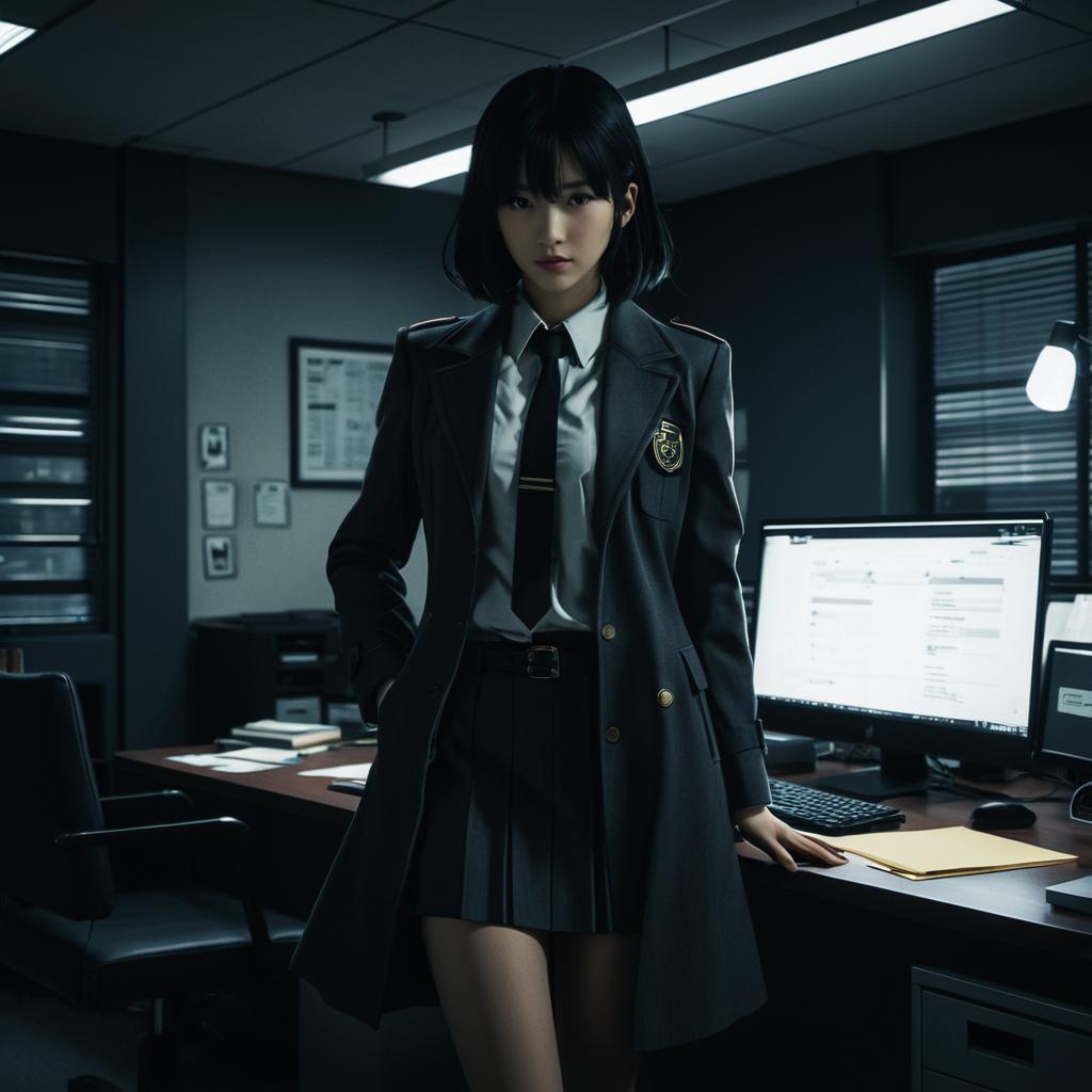 Full-body realistic image of an anime-style female detective with black hair standing in a dimly-lit office. She wears a dark gray coat over a white shirt, black tie, and pleated skirt. The office includes a desk with documents, a computer, and moody cinematic lighting with dramatic shadows and a faint aura effect, inspired by manga noir visuals.