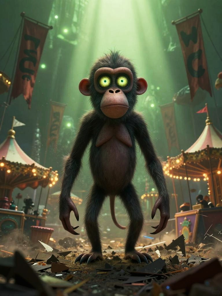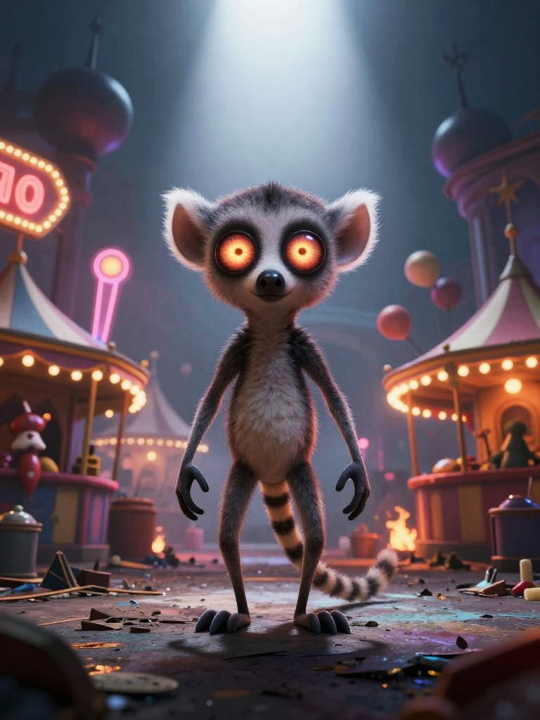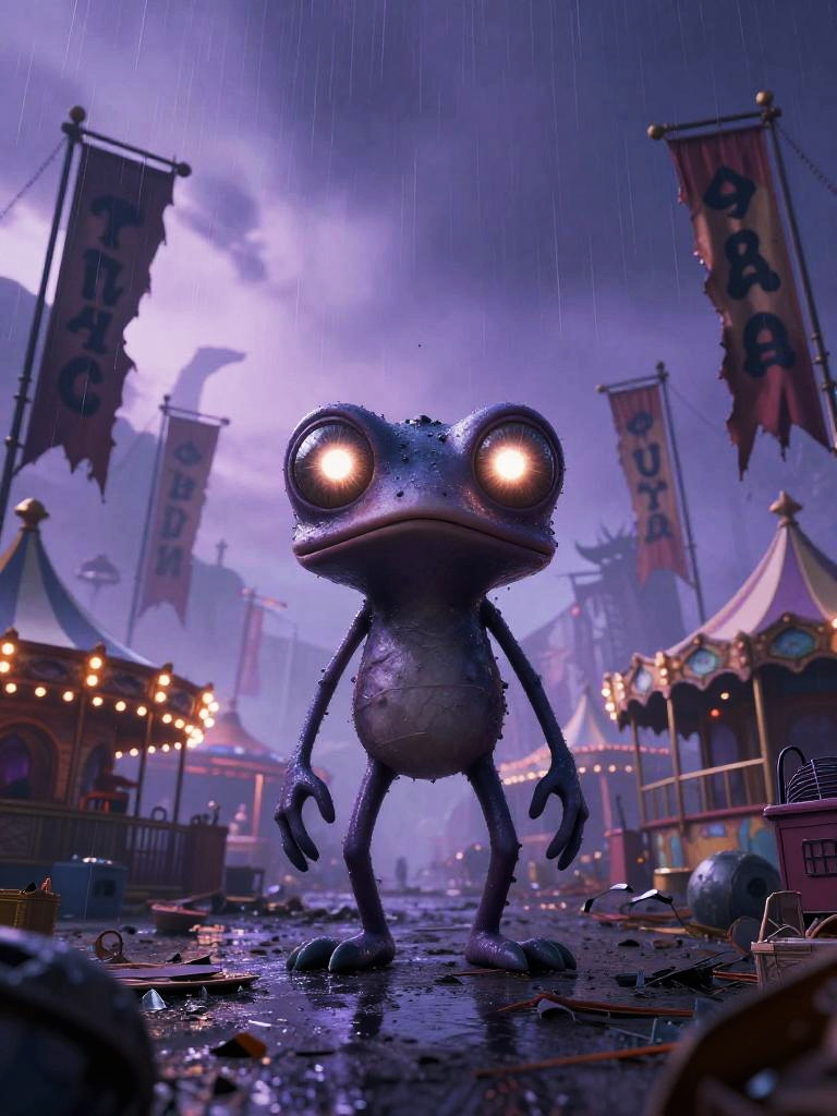 CGI horror image of a menacing, glowing-eyed, hairy, pig-like creature standing in a rain-soaked, abandoned carnival at night, surrounded by