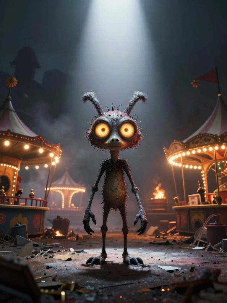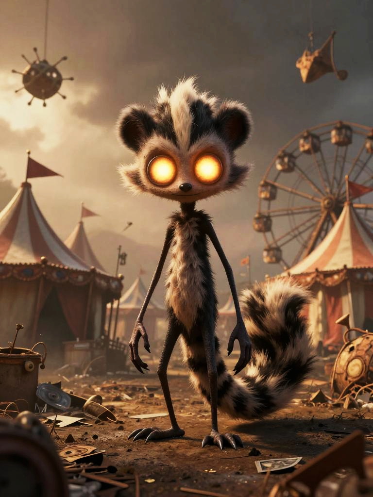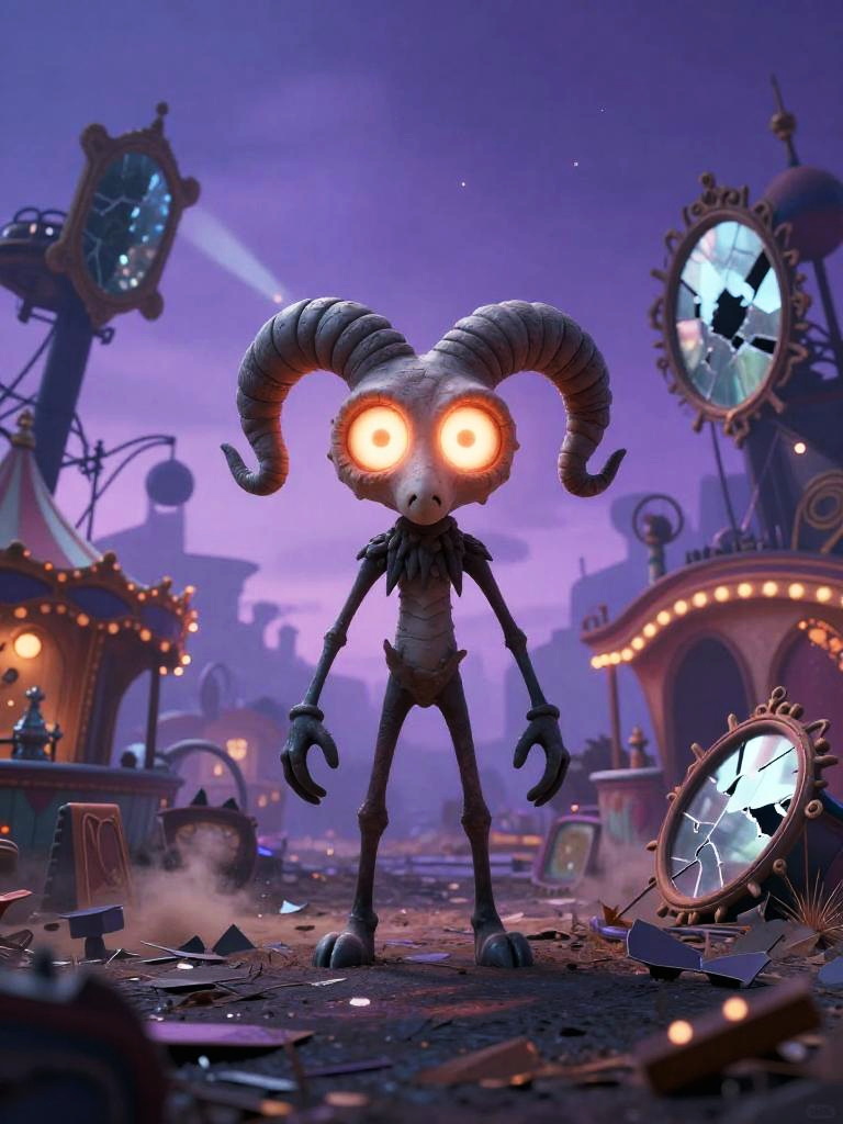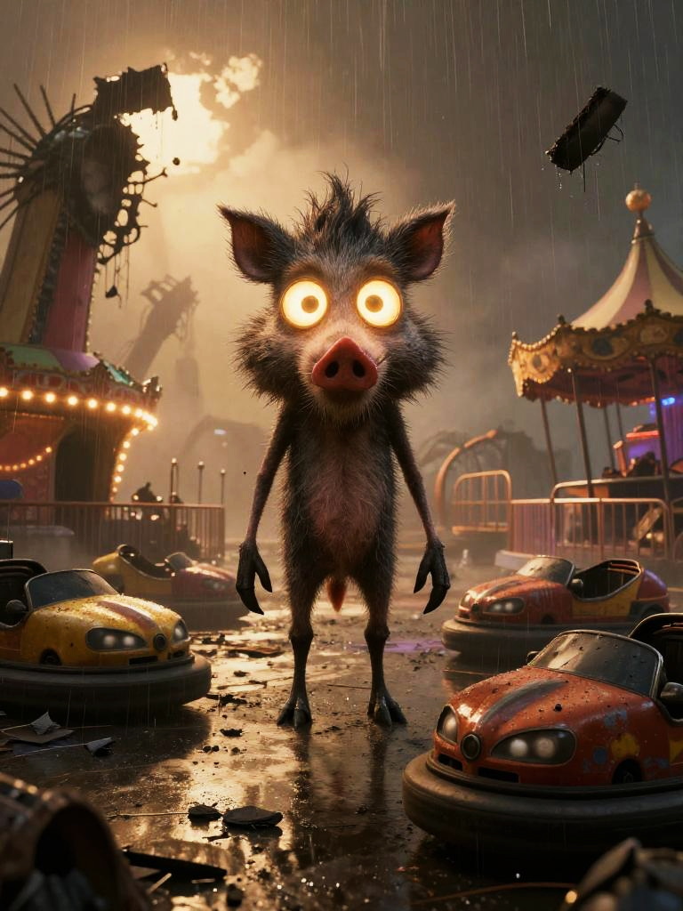 Spooky stylized boar character standing upright in the center of a ruined carnival, huge glowing eyes staring at the viewer, long skinny limbs, surrounded by half-sunken bumper cars and twisted rails with broken attractions and debris, light rain and hanging fog filling the air, cinematic wide-angle shot, dark whimsical fantasy style, highly detailed 3d illustration, soft volumetric dim golden glow light, high resolution