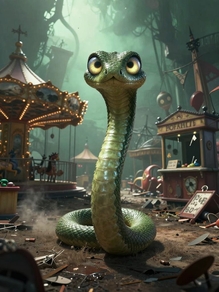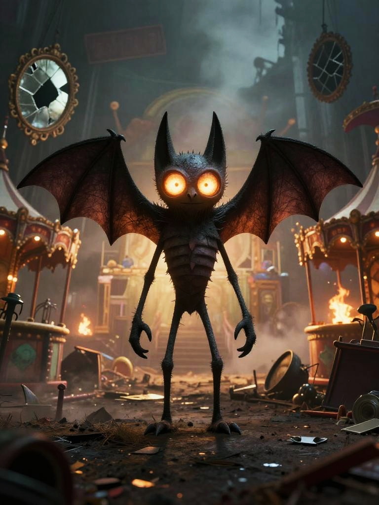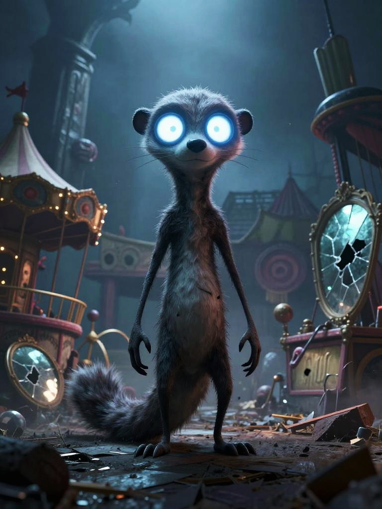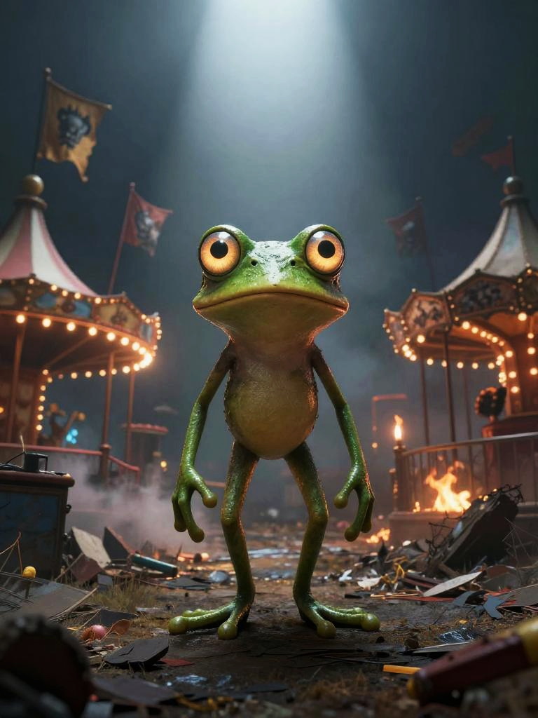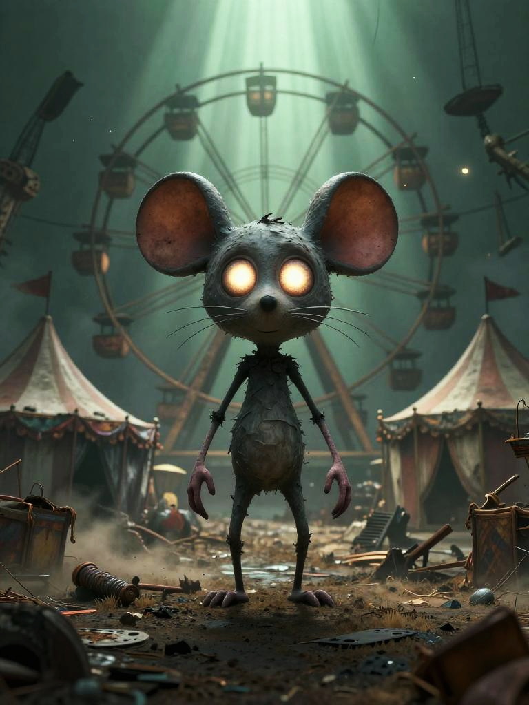 Spooky stylized boar character standing upright in the center of a ruined carnival, huge glowing eyes staring at the viewer, long skinny limbs, surrounded by half-sunken bumper cars and twisted rails with broken attractions and debris, light rain and hanging fog filling the air, cinematic wide-angle shot, dark whimsical fantasy style, highly detailed 3d illustration, soft volumetric dim golden glow light, high resolution