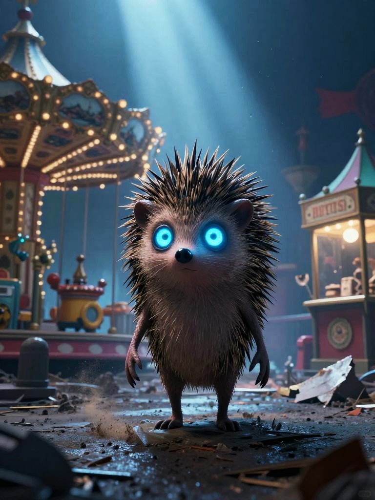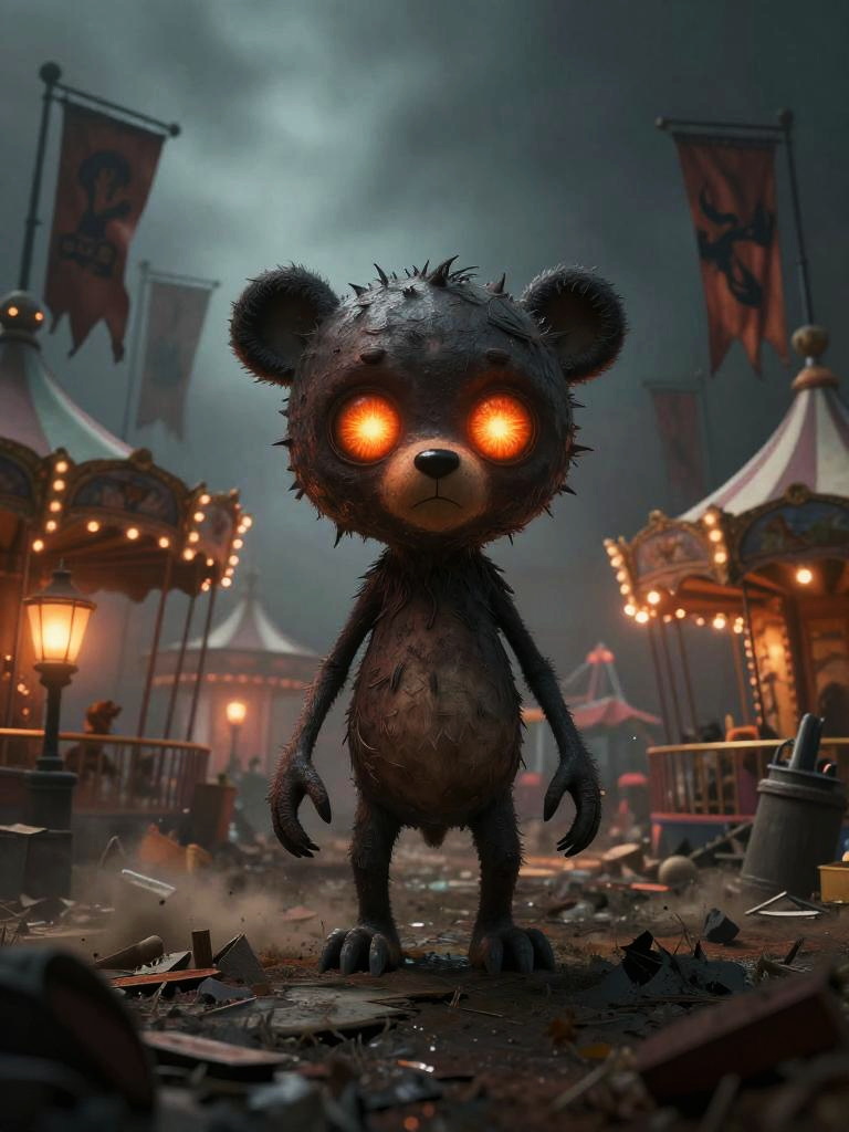 A CGI digital artwork depicts a creepy, anthropomorphic wild boar with glowing yellow eyes standing in a rain-soaked amusement park at night. The boar has a furry, dark brown and black body with exaggerated, spiky hair and a snout. Surrounding it are damaged, upturned go-karts and a broken, rusted carousel with a torn canopy. The background shows a foggy, dimly lit scene with scattered light bulbs and a torn Ferris wheel. The wet ground reflects the ambient light, adding to the eerie atmosphere. The boar's intense eyes and the ruined amusement park create a chilling, unsettling mood.